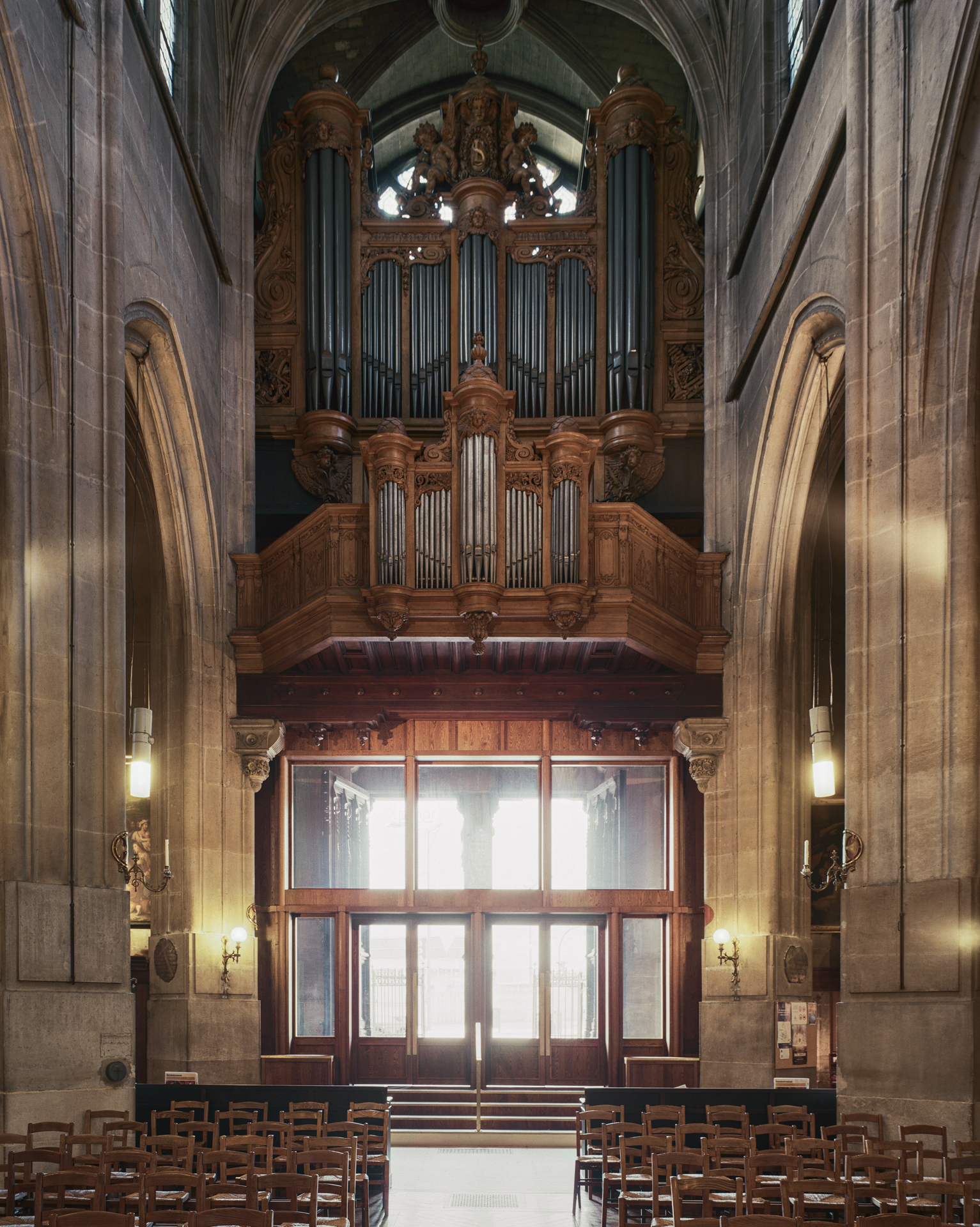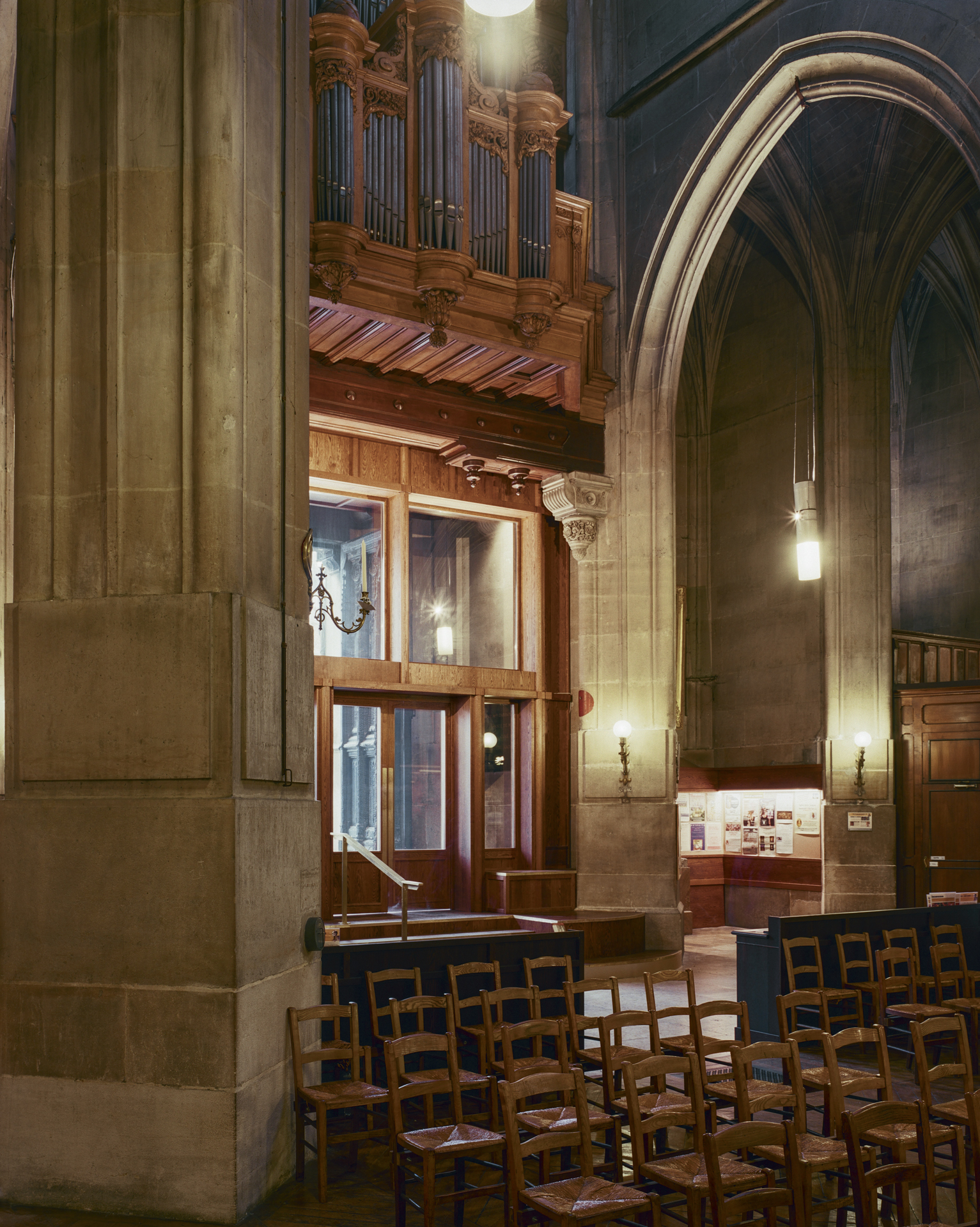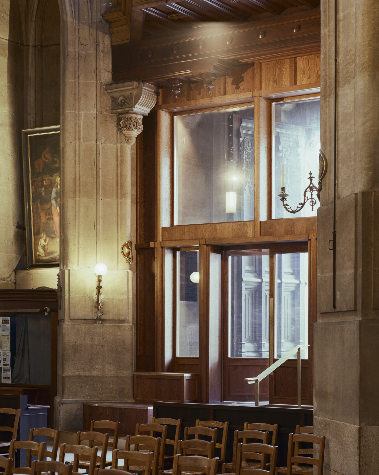 Pour répondre aux besoins de la paroisse, le projet offre un espace d’entrée accueillant et confortable. Une estrade en bois permet de créer un palier au droit des portes et des assises pour les fidèles et les visiteurs. L’imposte vitrée, soigneusement proportionnée, garantit depuis l’extérieur la visibilité des voutes enrichies par des clés sculptées à la croisée des ogives. Un plafond en bois protège le plancher de l’orgue et en reprend la structure par son relief.