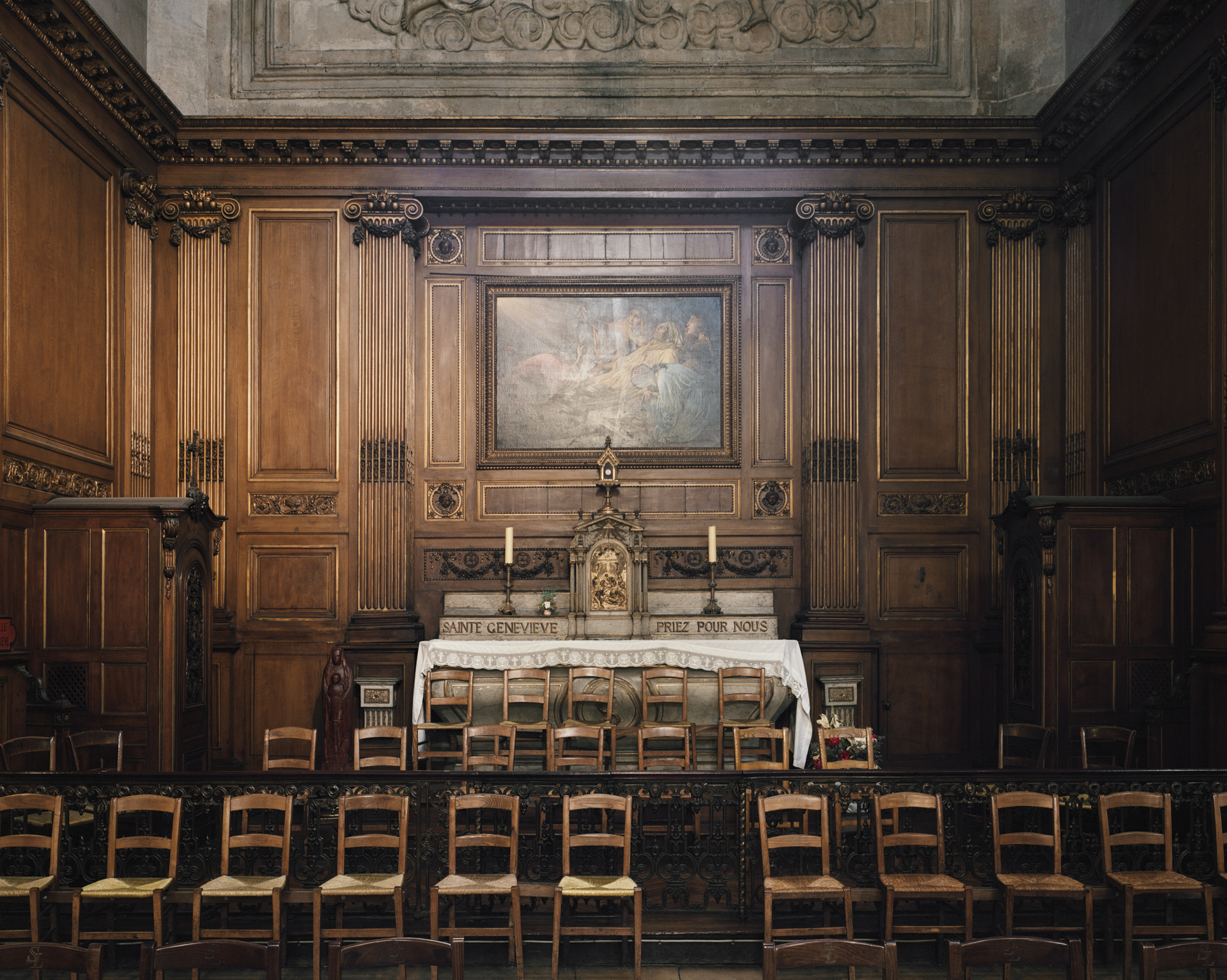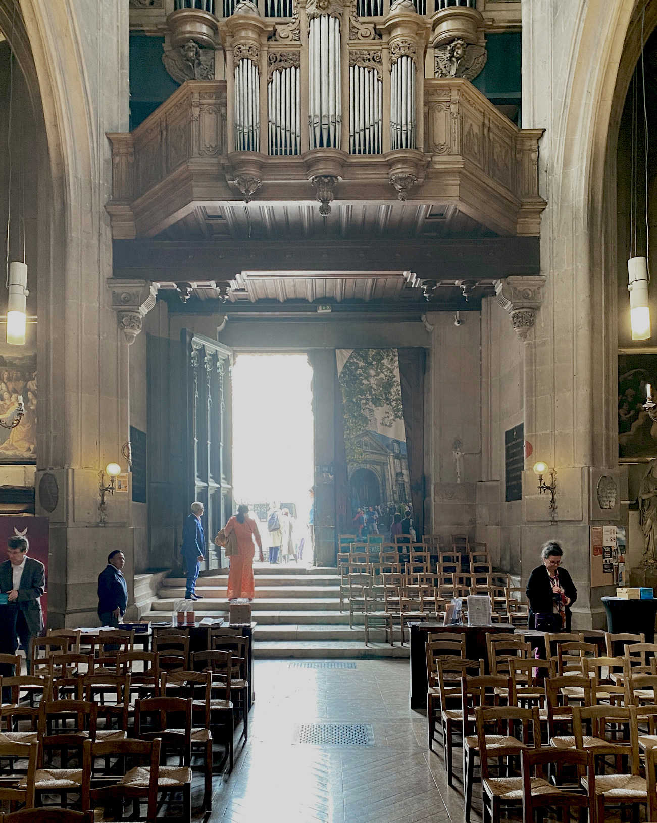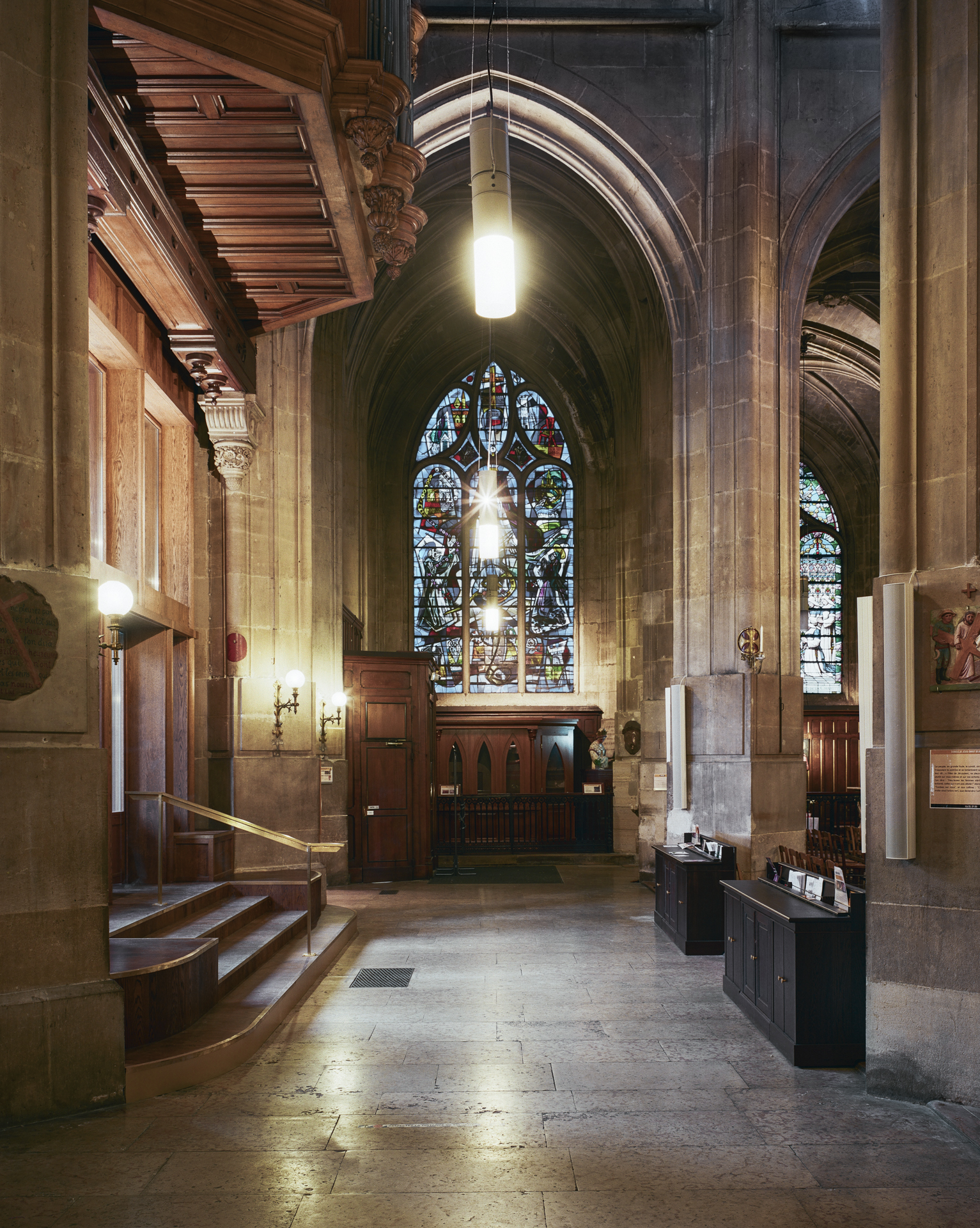 Pour répondre aux besoins de la paroisse, le projet offre un espace d’entrée accueillant et confortable. Une estrade en bois permet de créer un palier au droit des portes et des assises pour les fidèles et les visiteurs. L’imposte vitrée, soigneusement proportionnée, garantit depuis l’extérieur la visibilité des voutes enrichies par des clés sculptées à la croisée des ogives. Un plafond en bois protège le plancher de l’orgue et en reprend la structure par son relief.