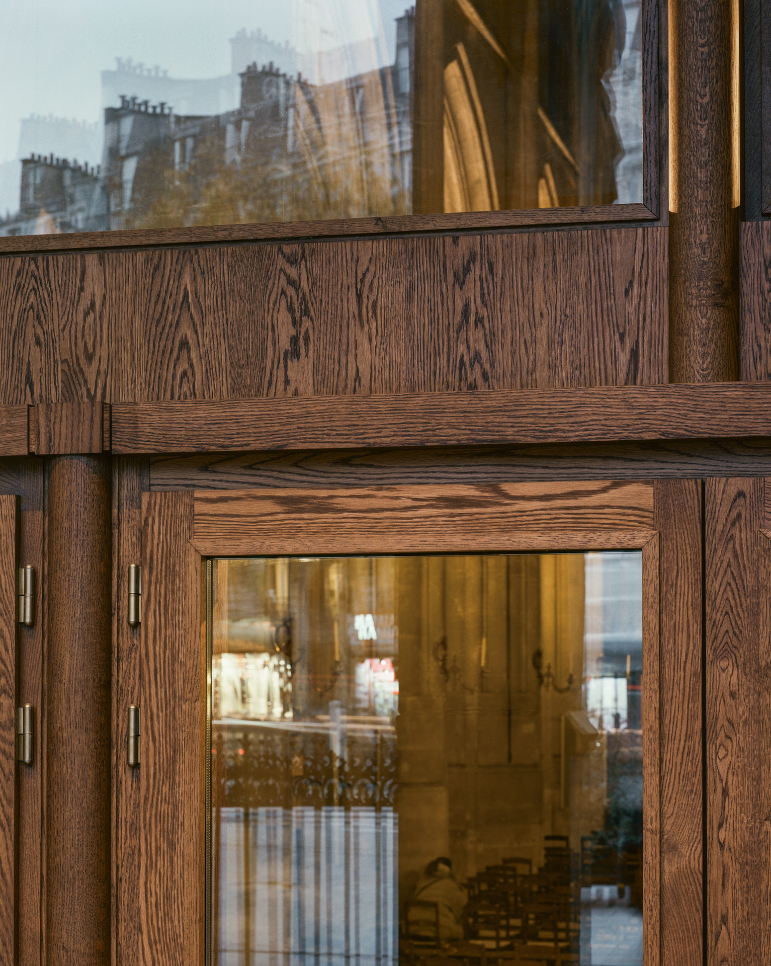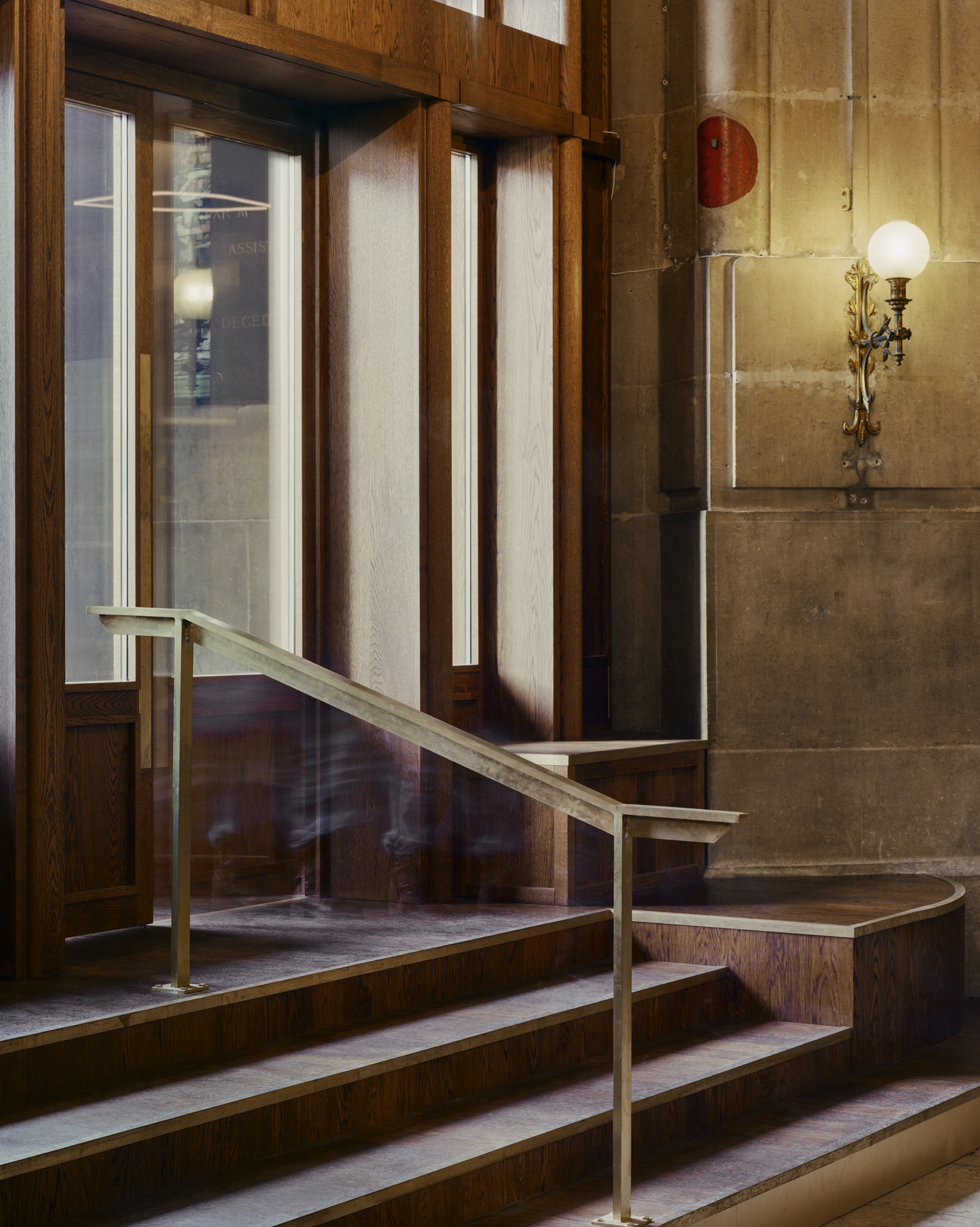 La nouvelle entrée améliore la visibilité de l’intérieur depuis le parvis et le boulevard, tout en offrant une protection efficace contre le froid et le bruit. Inspirée de la tradition du mobilier d’église, le projet prévoit l’installation d’une paroi et d’une estrade en bois, verre et laiton.