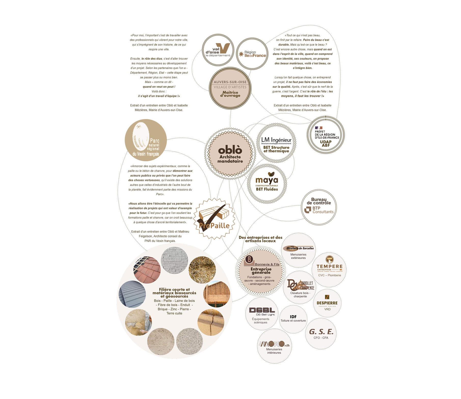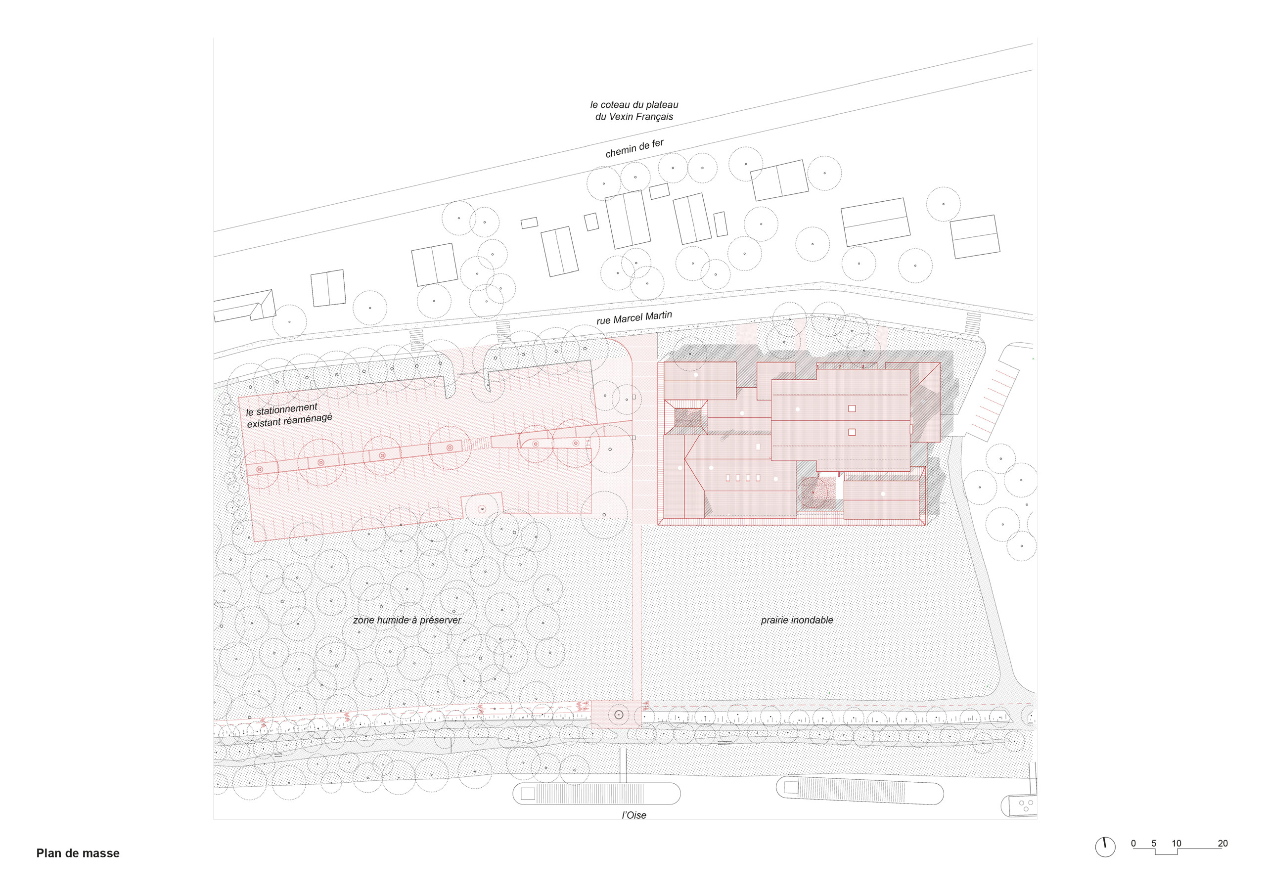 La Maison de l’Isle se situe au croisement de plusieurs systèmes interconnectés. Porte d’entrée depuis l’Oise par la halte fluviale, elle se situe entre la rivière et le plateau du Vexin. Elle constitue l’un des pôles du réseau culturel et associatif de la ville, servant d’équipement polyvalent à la Communauté de Communes. Le projet, portant initialement sur la rénovation énergétique du bâtiment des années 1980, s’élargit à une réorganisation profonde du site, et vise à relancer sa dimension collective.