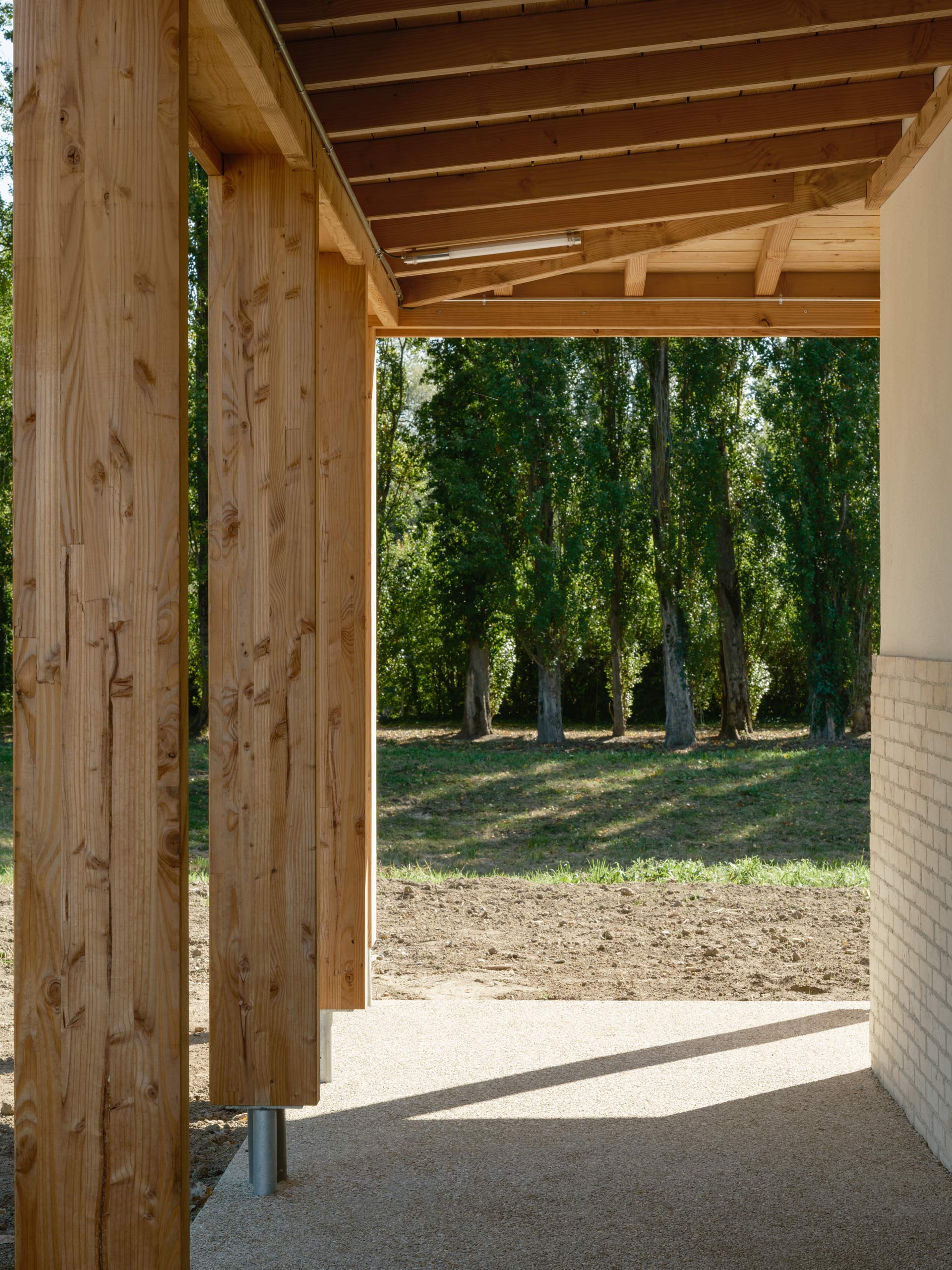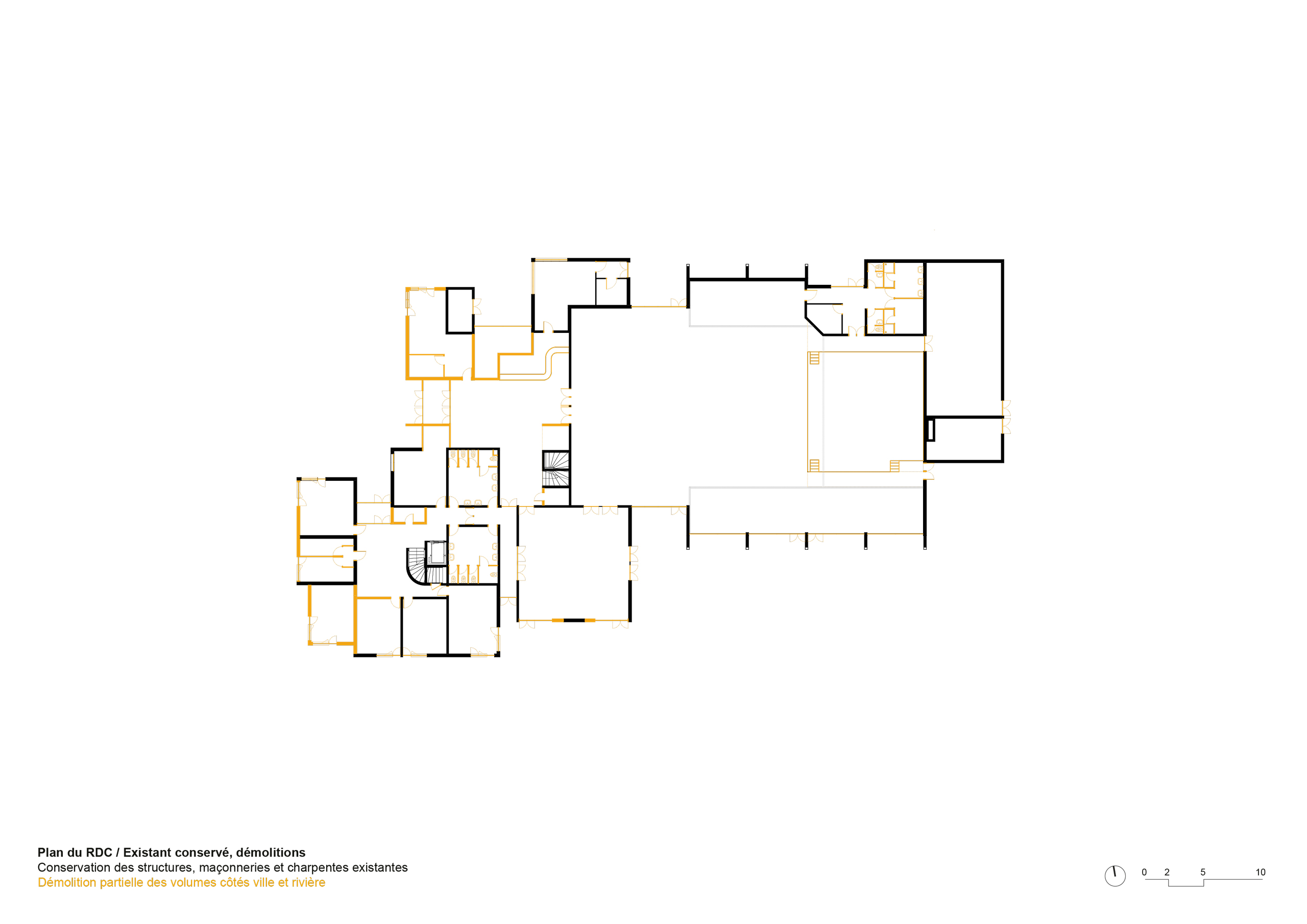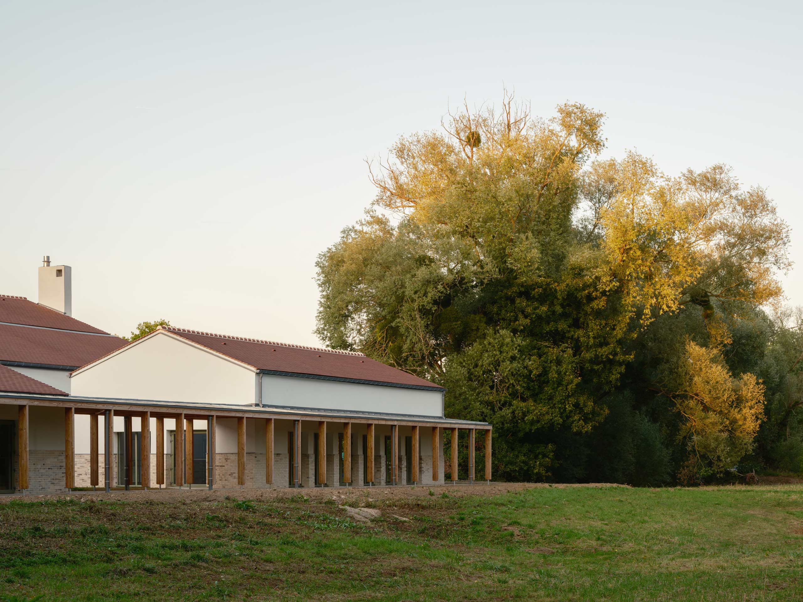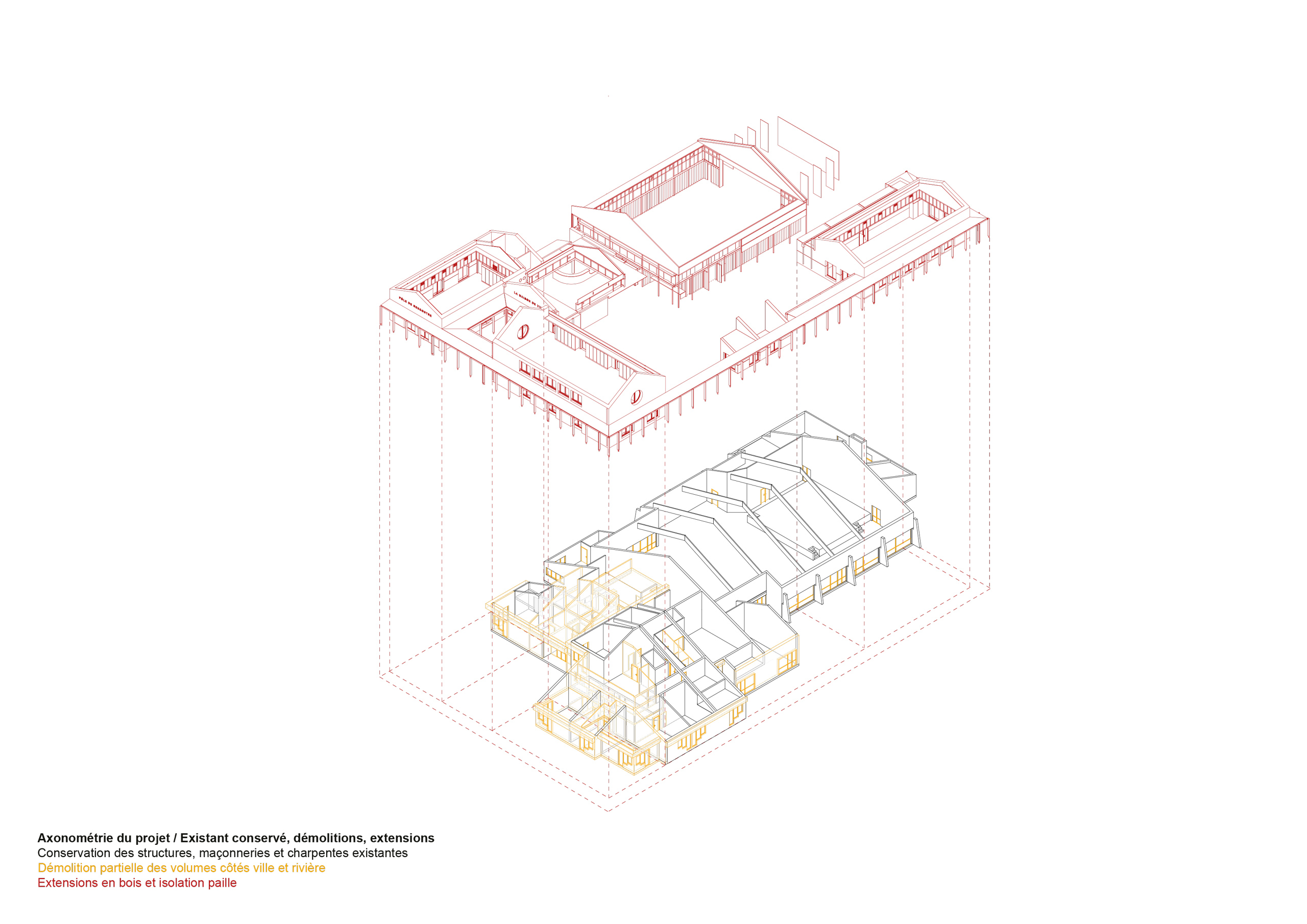 Le bâtiment existant, dont les structures sont en grande partie conservées, est simplifié dans sa forme et distribution. Il est complété par trois volumes polyvalents au profit d’échanges intergénérationnels, s’inscrivant dans le périmètre bâti actuel afin de limiter l’artificialisation du terrain. Ces extensions tirent profit du contexte, et se situent sur les trois angles les plus sollicités dans la relation avec le village et la rivière. Les intérieurs sont réaménagés à partir d’une série d’espaces d’accueil et circulation.