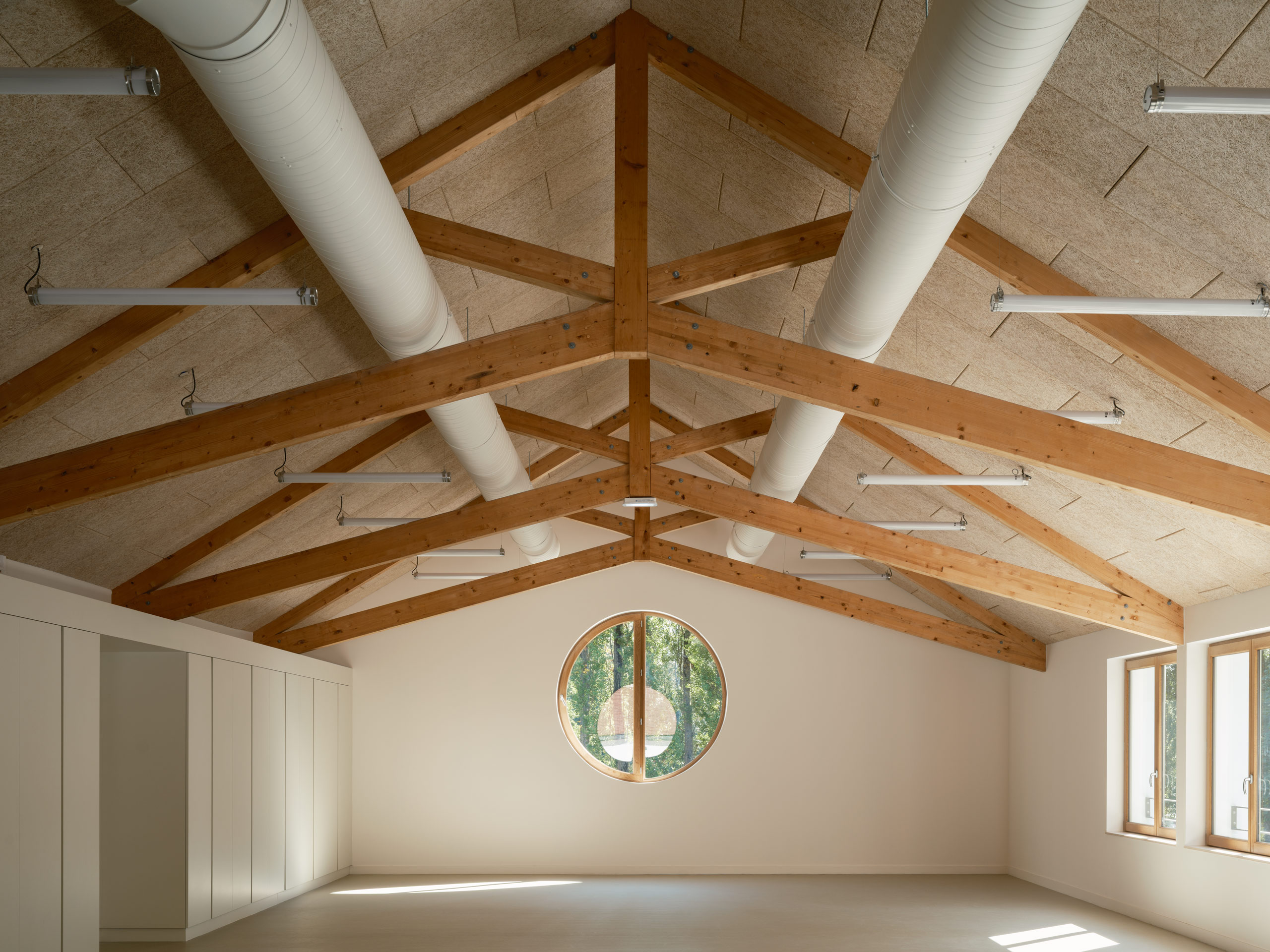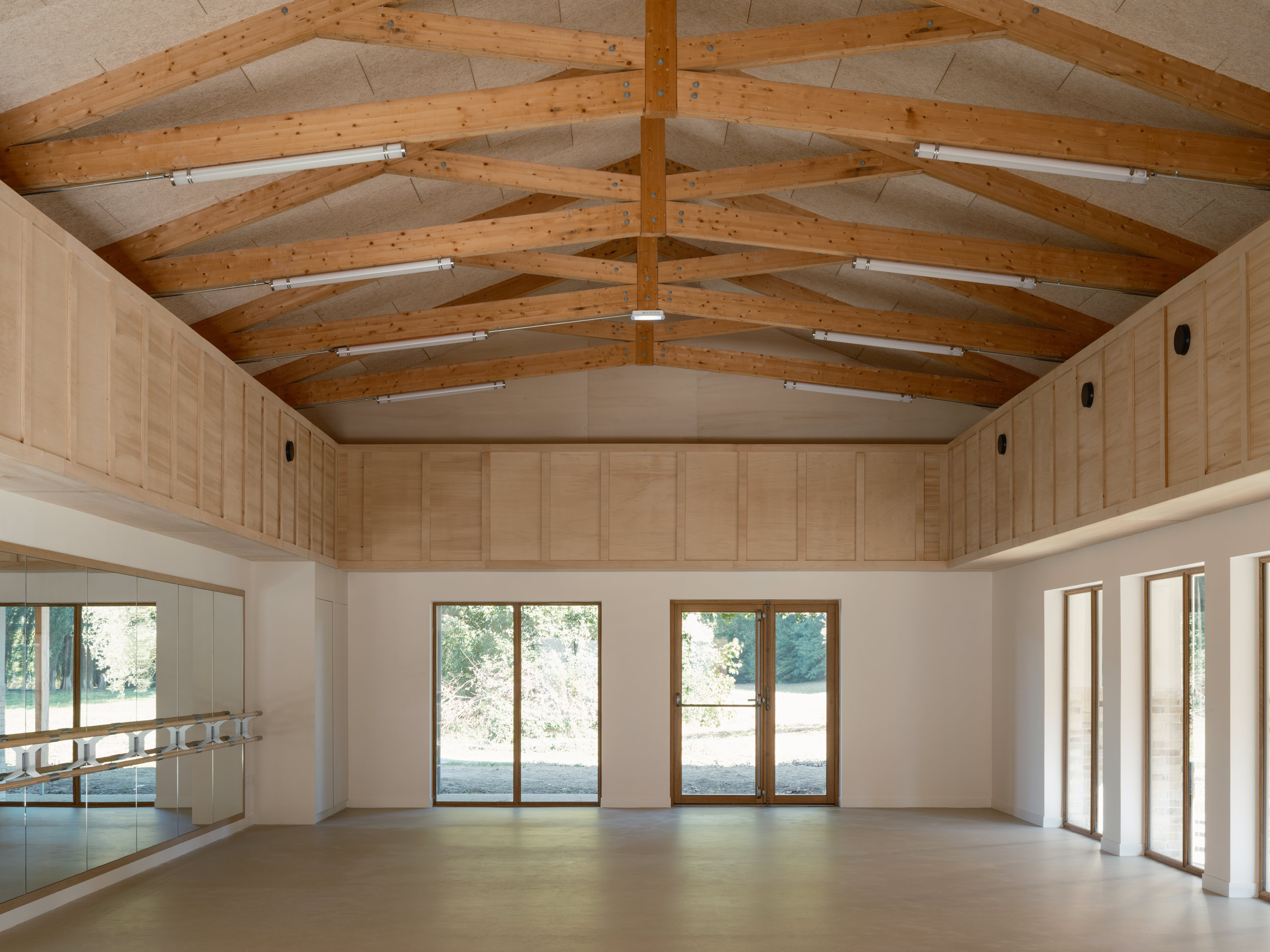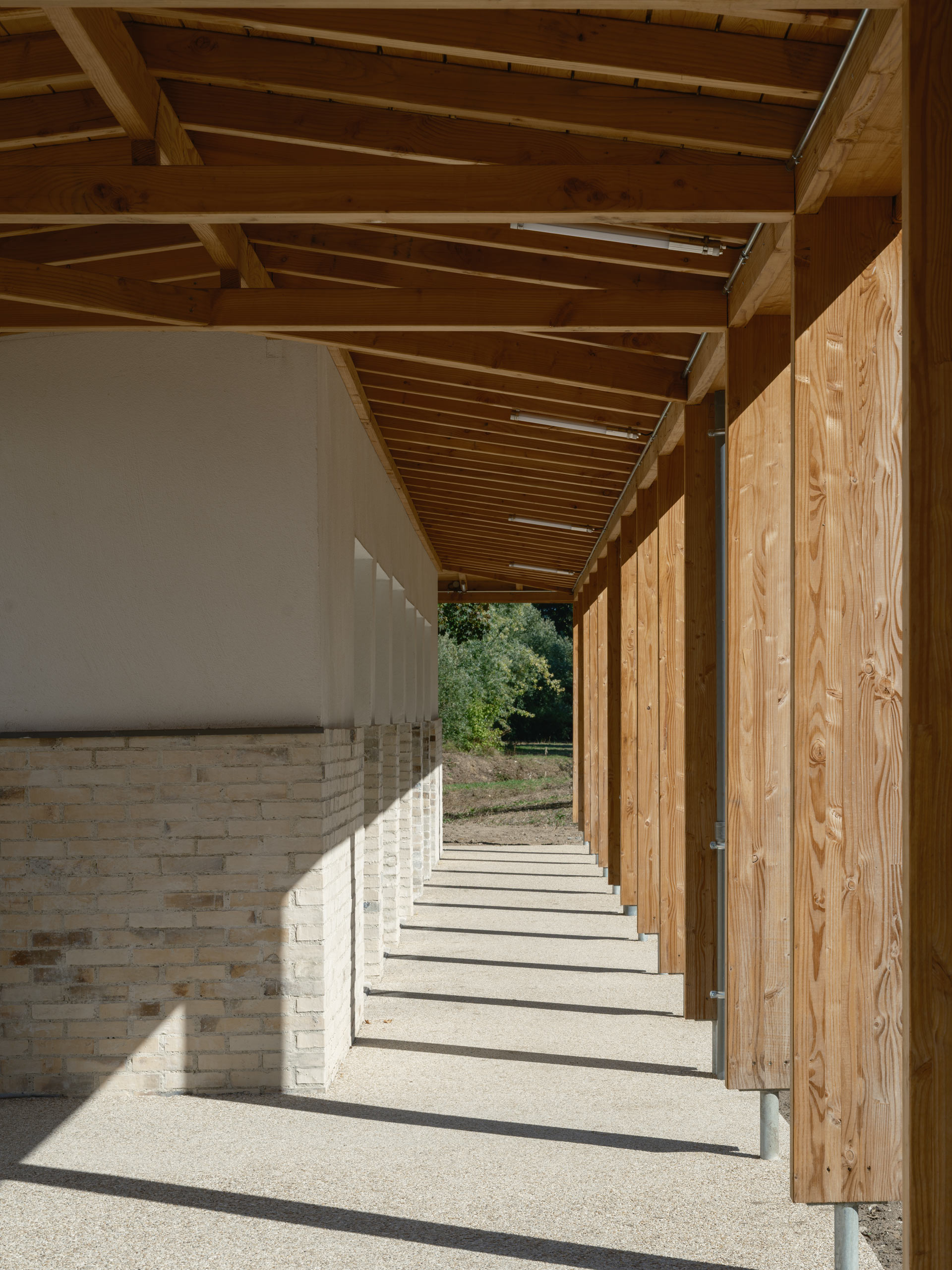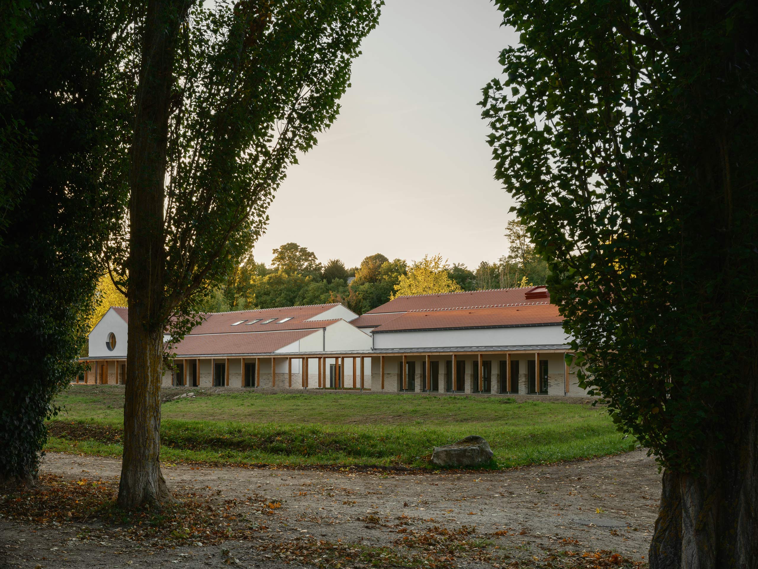 Le bâtiment existant, dont les structures sont en grande partie conservées, est simplifié dans sa forme et distribution. Il est complété par trois volumes polyvalents au profit d’échanges intergénérationnels, s’inscrivant dans le périmètre bâti actuel afin de limiter l’artificialisation du terrain. Ces extensions tirent profit du contexte, et se situent sur les trois angles les plus sollicités dans la relation avec le village et la rivière. Les intérieurs sont réaménagés à partir d’une série d’espaces d’accueil et circulation.