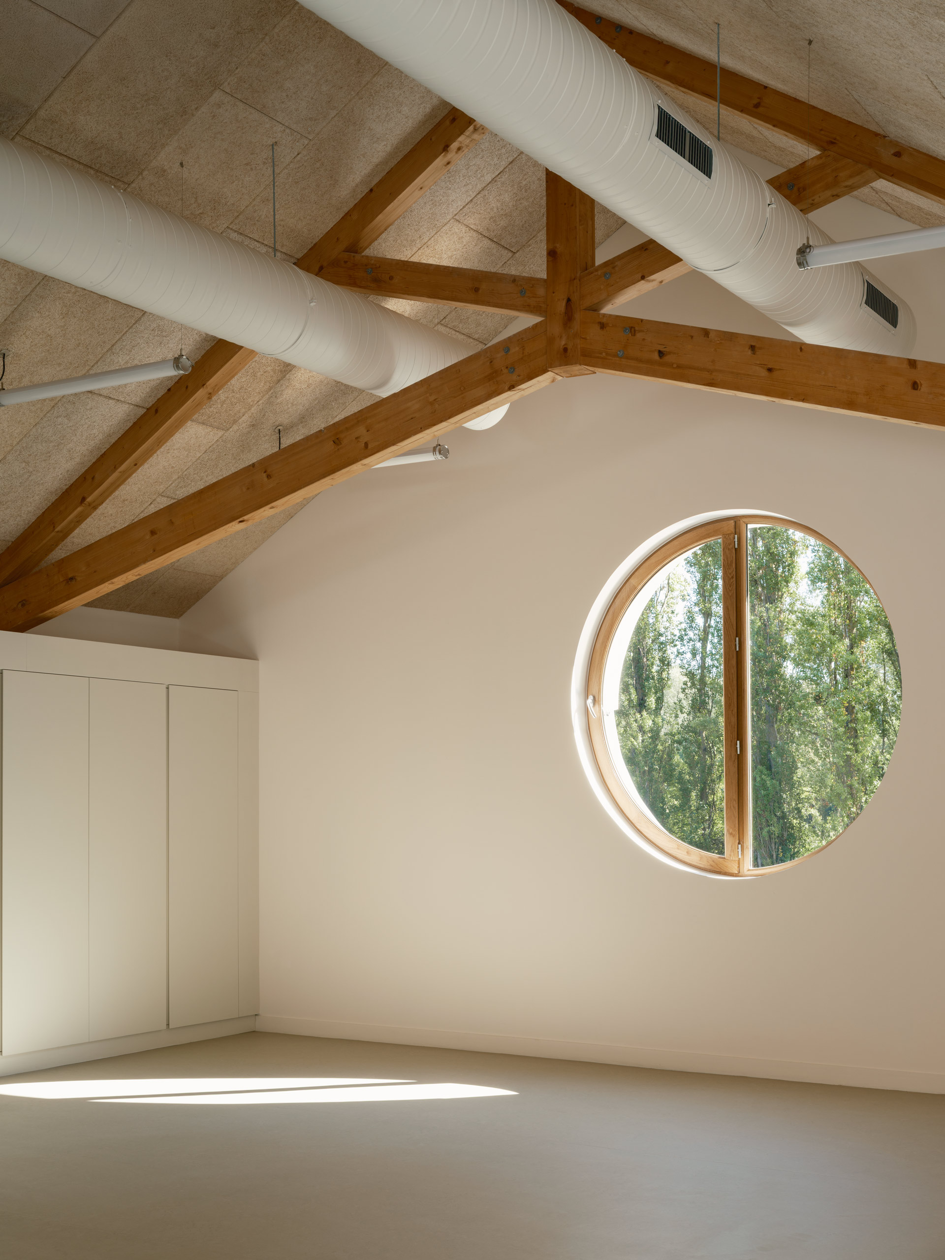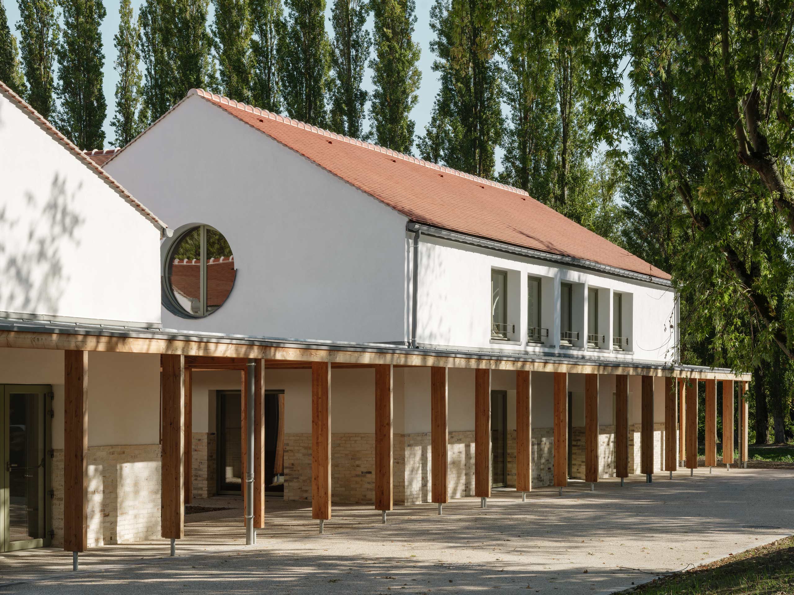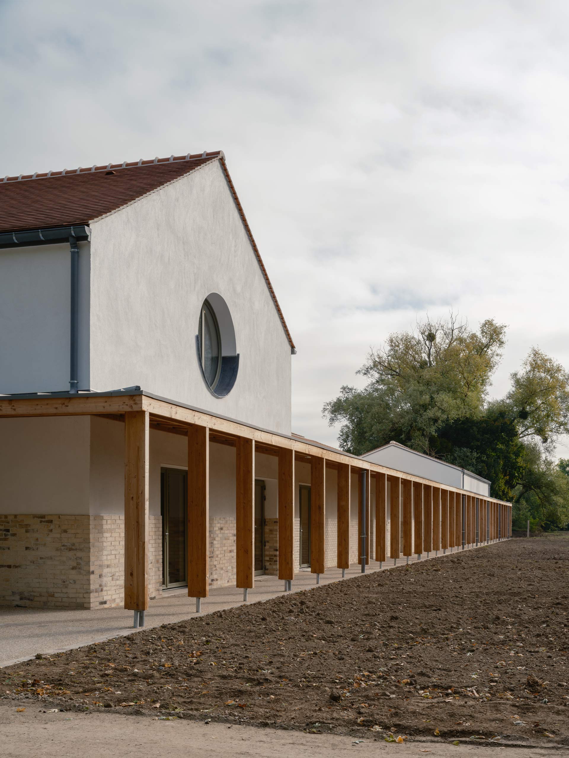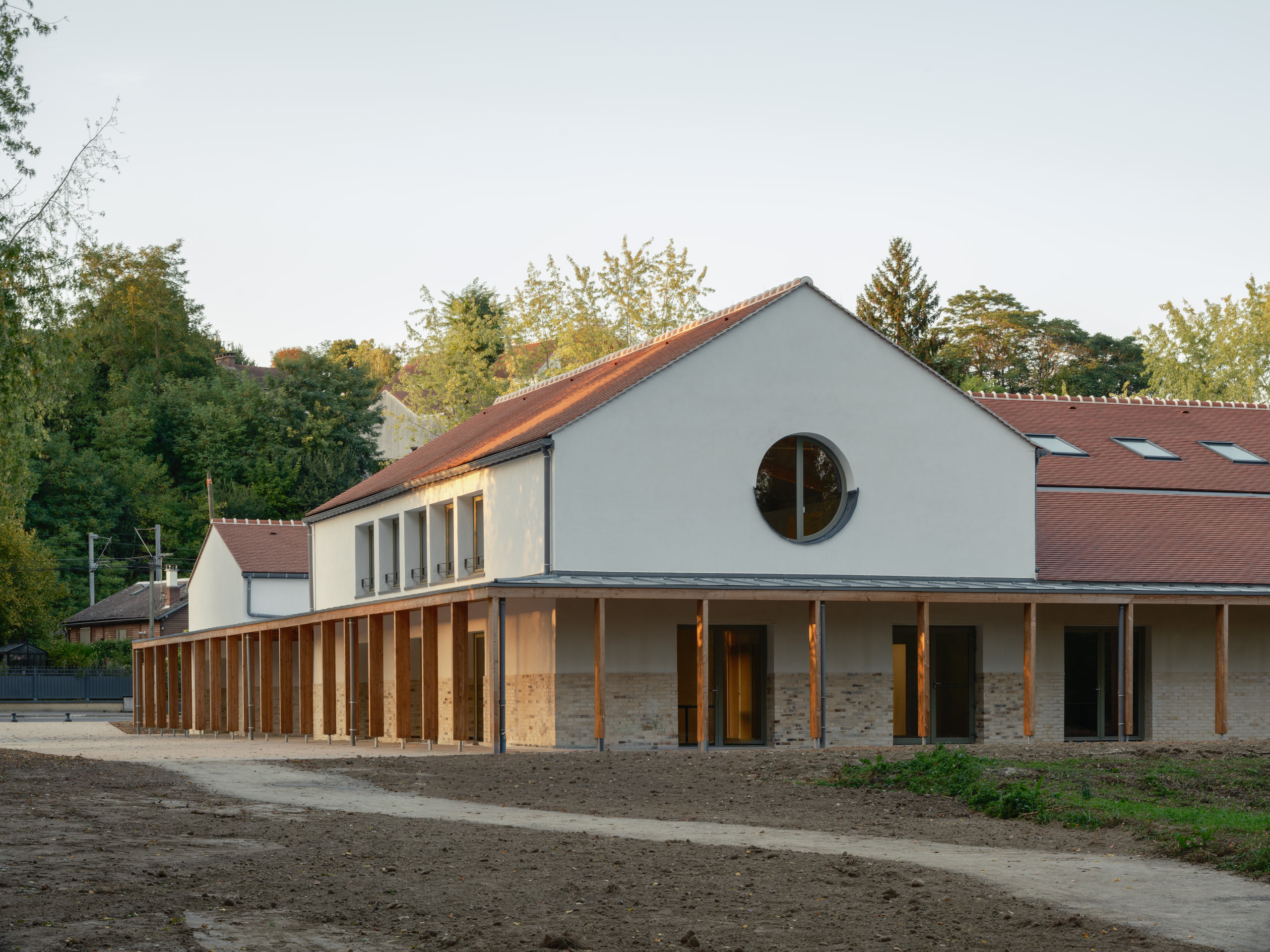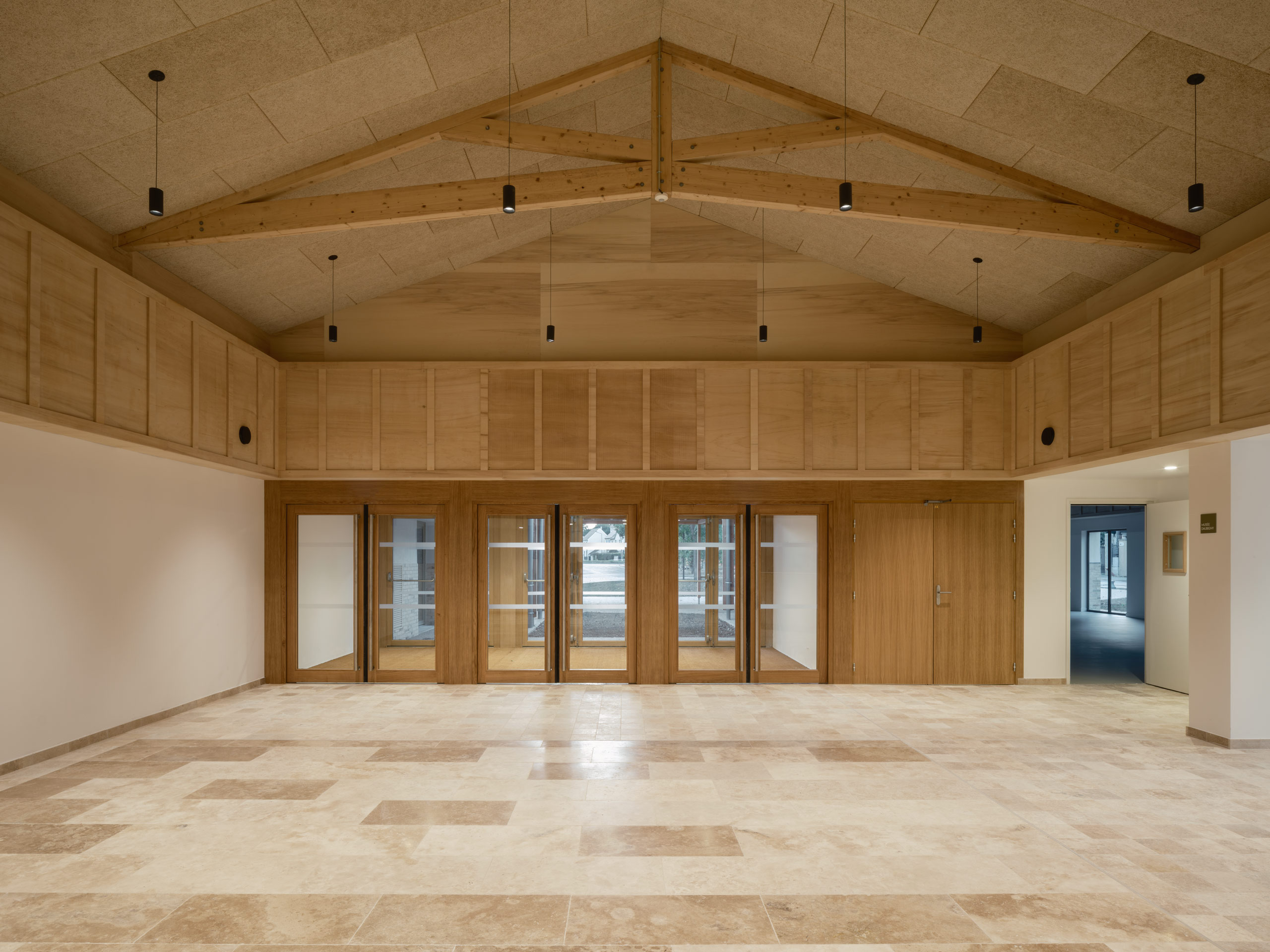 Le bâtiment existant, dont les structures sont en grande partie conservées, est simplifié dans sa forme et distribution. Il est complété par trois volumes polyvalents au profit d’échanges intergénérationnels, s’inscrivant dans le périmètre bâti actuel afin de limiter l’artificialisation du terrain. Ces extensions tirent profit du contexte, et se situent sur les trois angles les plus sollicités dans la relation avec le village et la rivière. Les intérieurs sont réaménagés à partir d’une série d’espaces d’accueil et circulation.