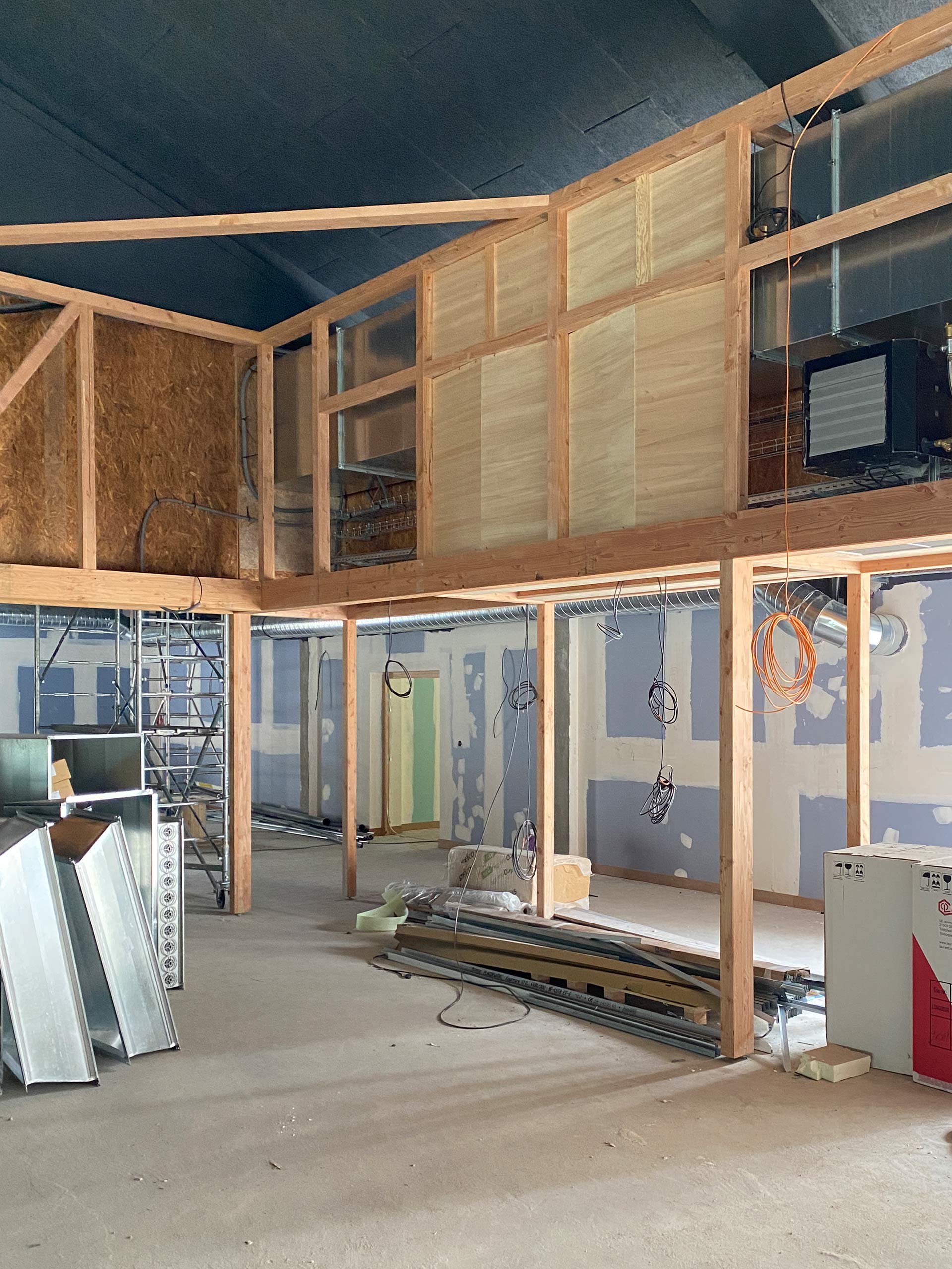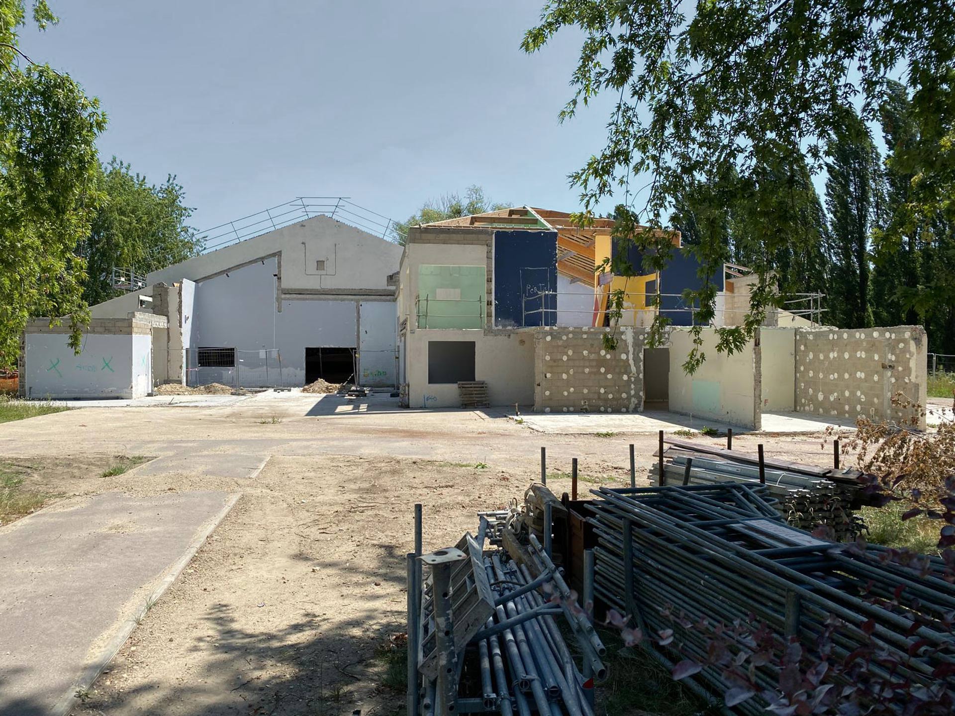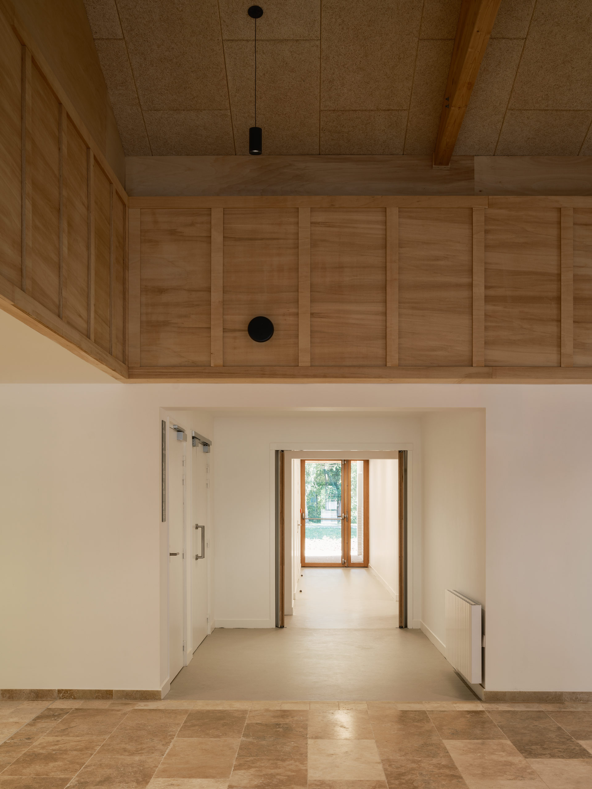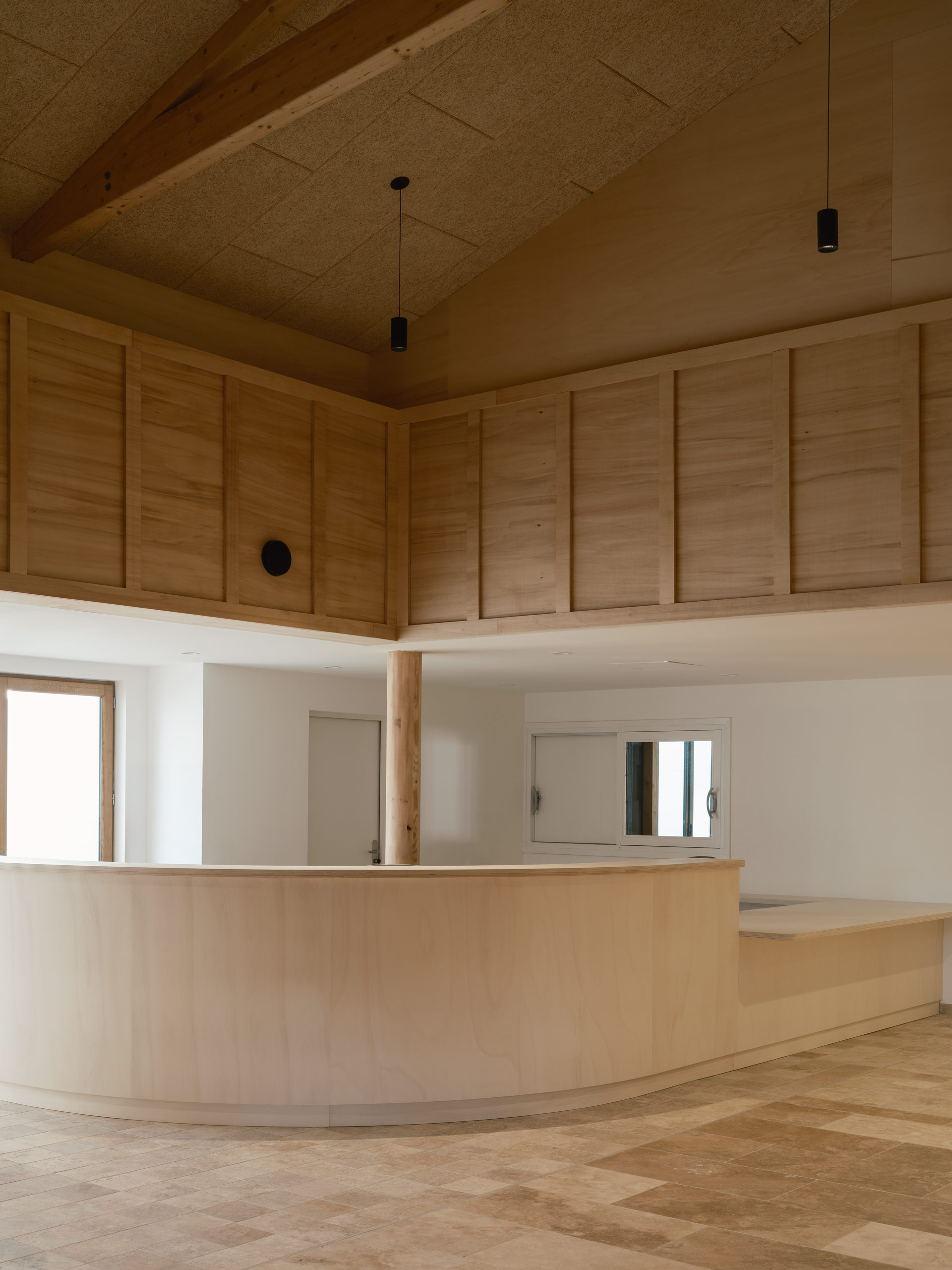 Le bâtiment existant, dont les structures sont en grande partie conservées, est simplifié dans sa forme et distribution. Il est complété par trois volumes polyvalents au profit d’échanges intergénérationnels, s’inscrivant dans le périmètre bâti actuel afin de limiter l’artificialisation du terrain. Ces extensions tirent profit du contexte, et se situent sur les trois angles les plus sollicités dans la relation avec le village et la rivière. Les intérieurs sont réaménagés à partir d’une série d’espaces d’accueil et circulation.