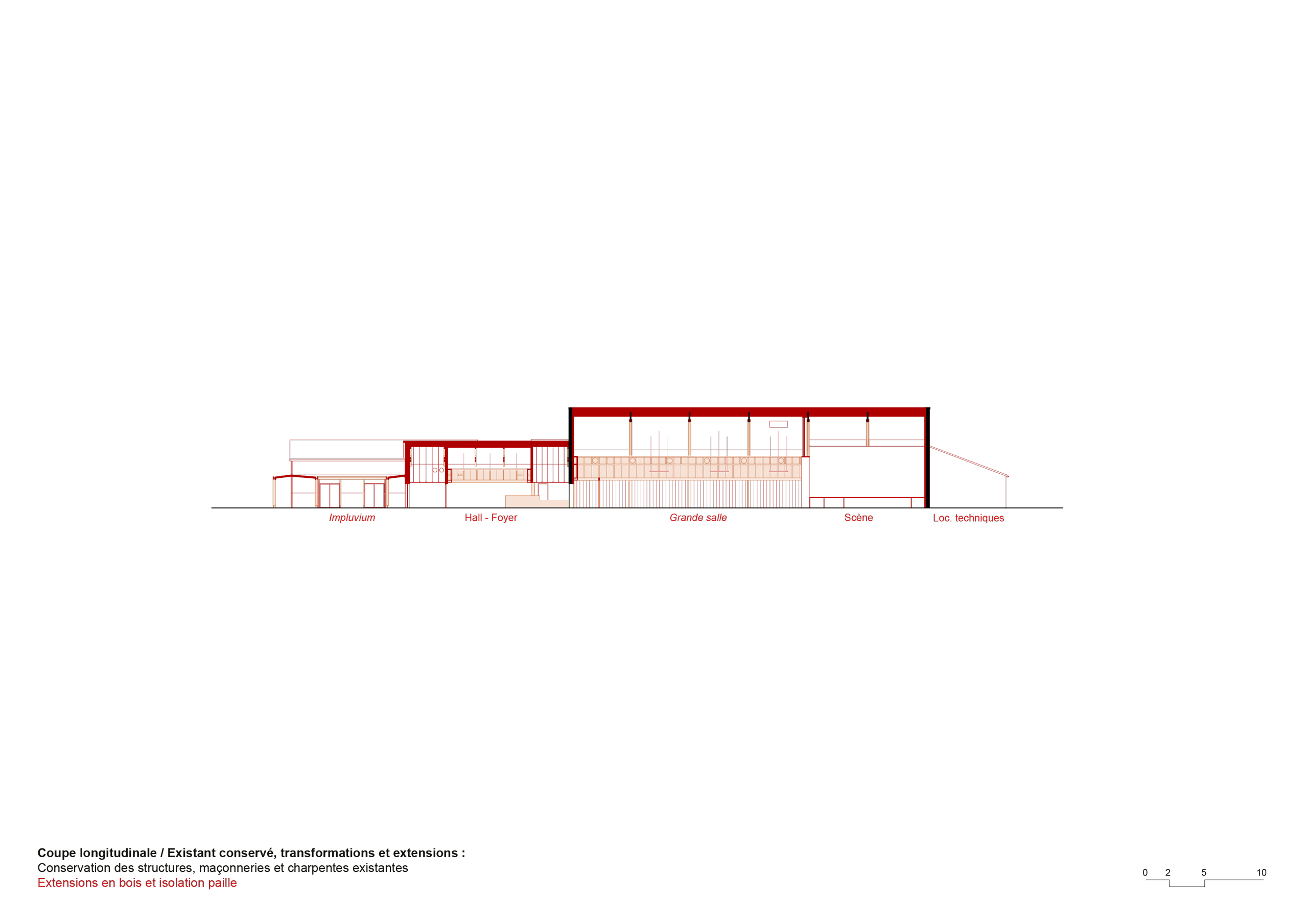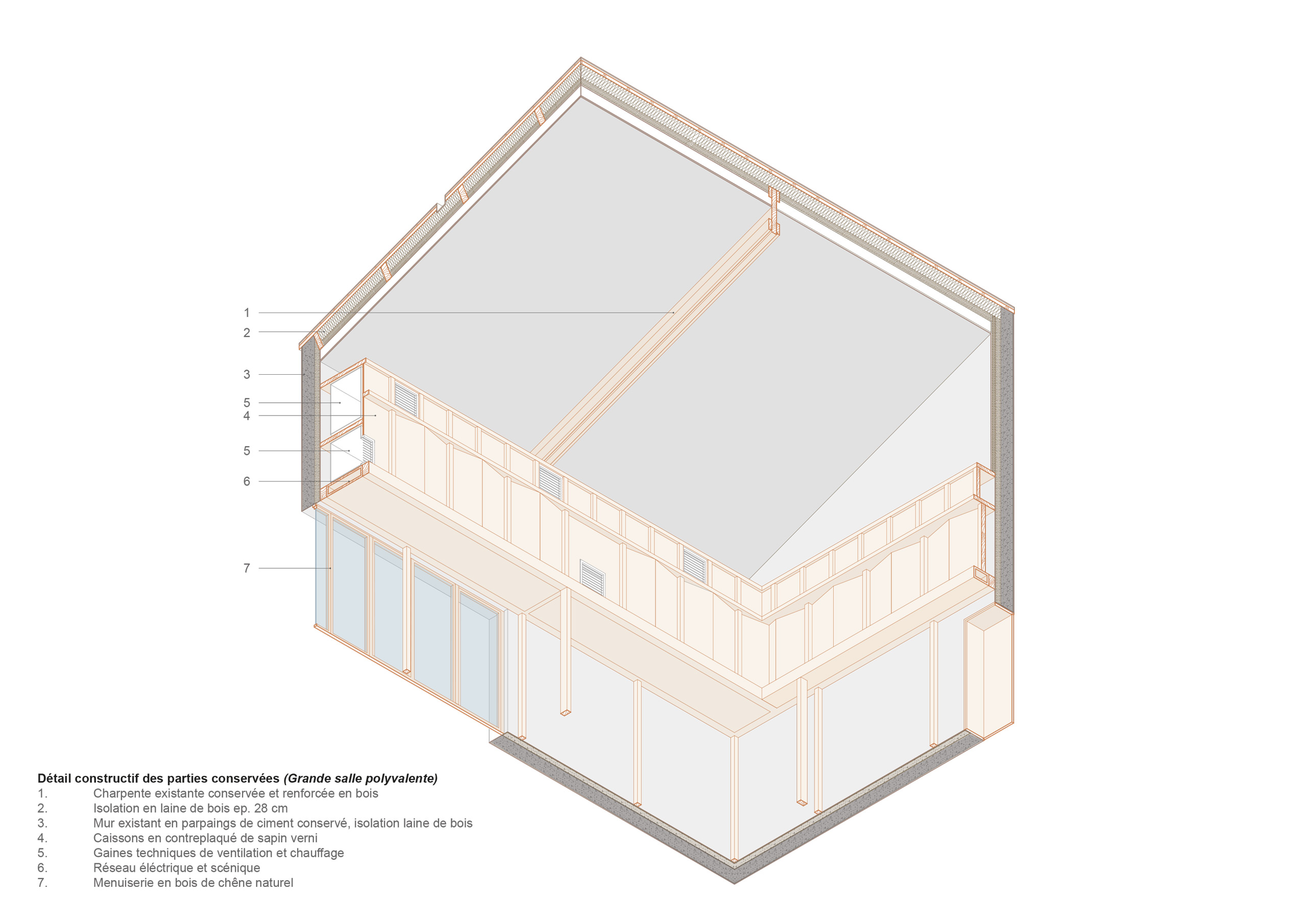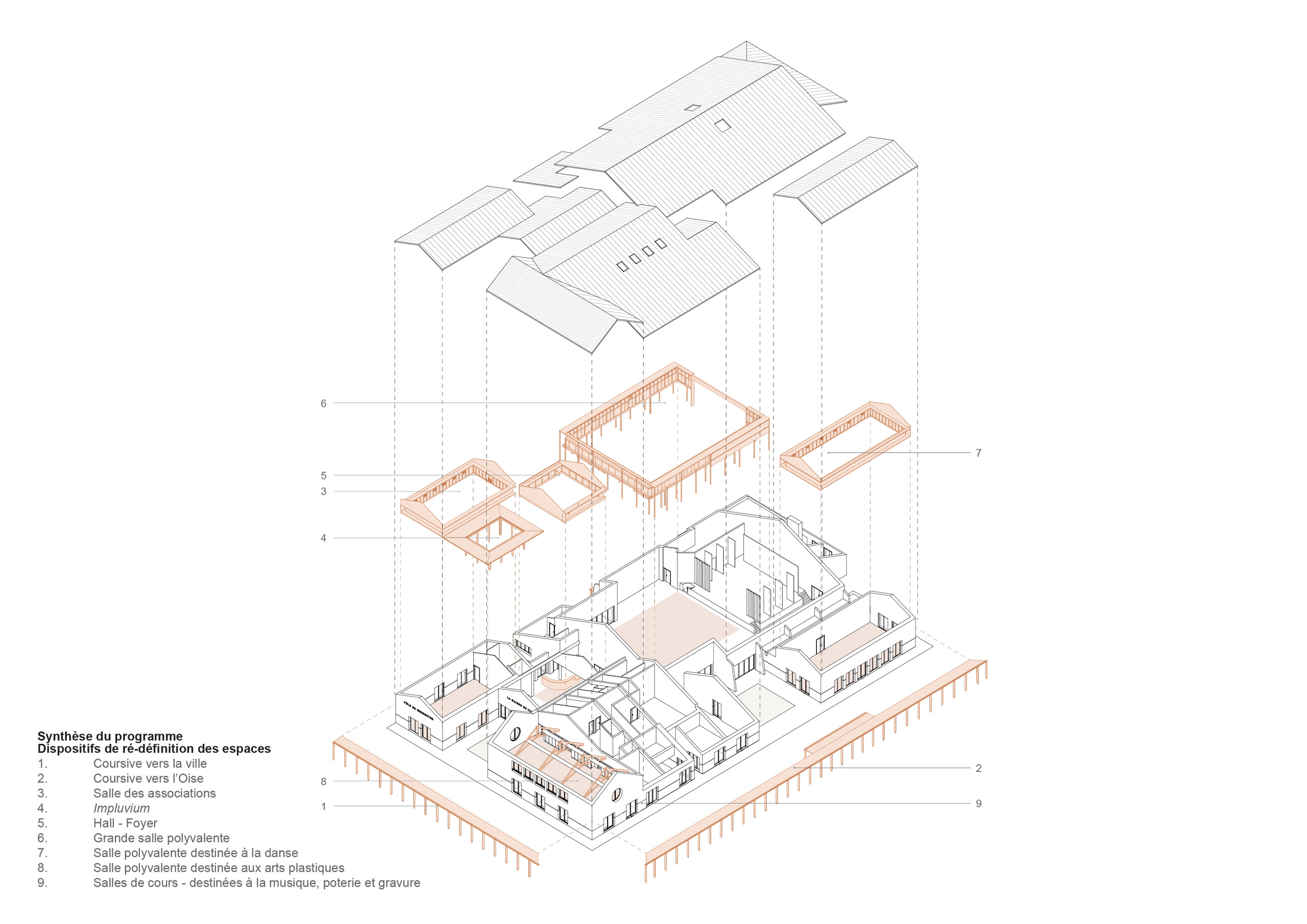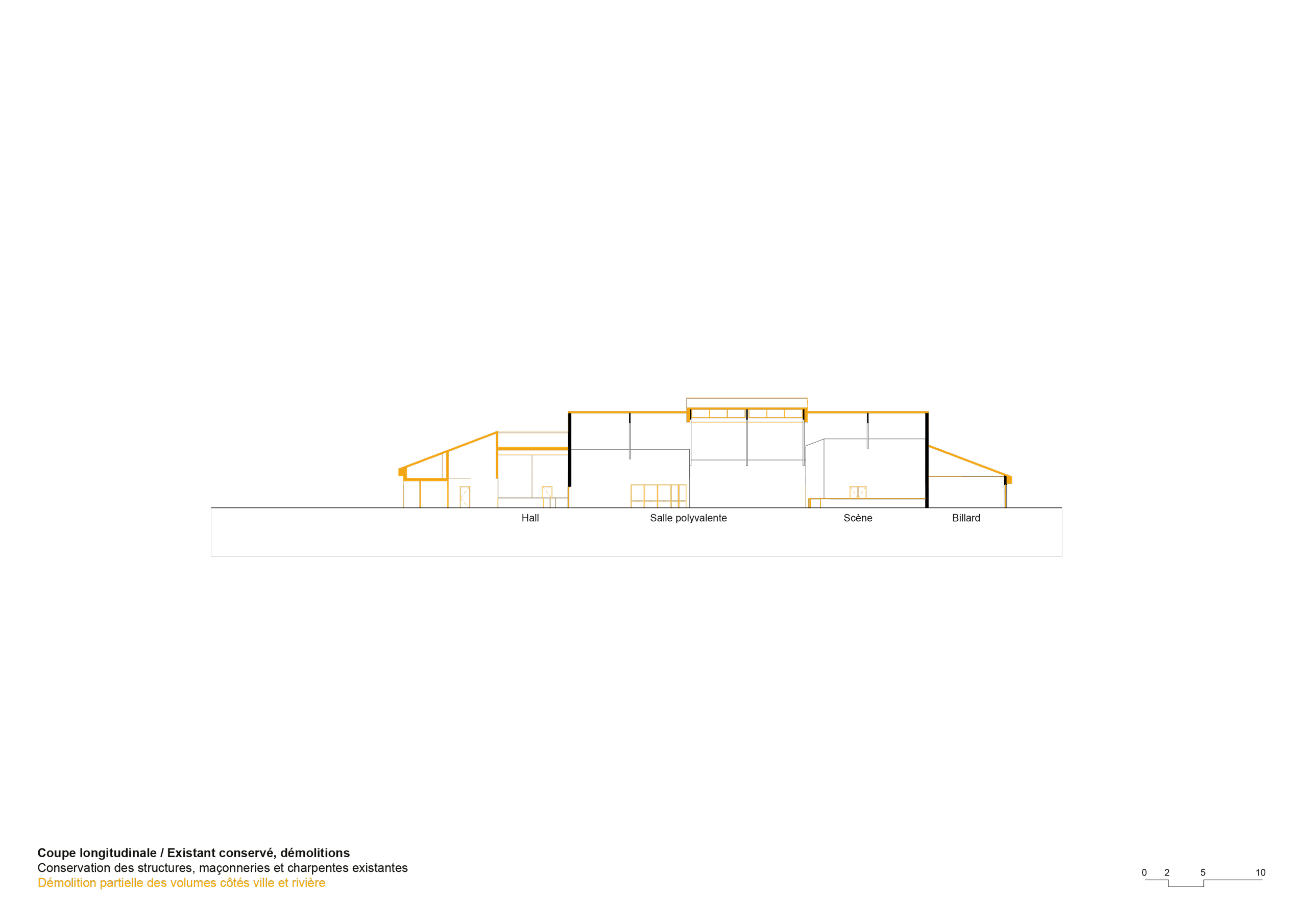 La relation entre le bâtiment et son site est repensée à travers une coursive périmétrale qui fait référence aux anciens équipements de loisir le long de l’Oise : elle cerne les volumes et constitue un espace intermédiaire, ouvert et couvert, qui devient accès principal côté ville et protection perméable côté fleuve. Polyvalent, il offre un espace de distribution extérieure, protège les pièces de l’ensoleillement direct et accompagne le visiteur dans une séquence maitrisée vers l’intérieur. La grande salle centrale est réaménagée par un dispositif intégrant les organes techniques et permettant de réorganiser l’espace en fonction de l’usage : concerts, expositions, réunions publiques…