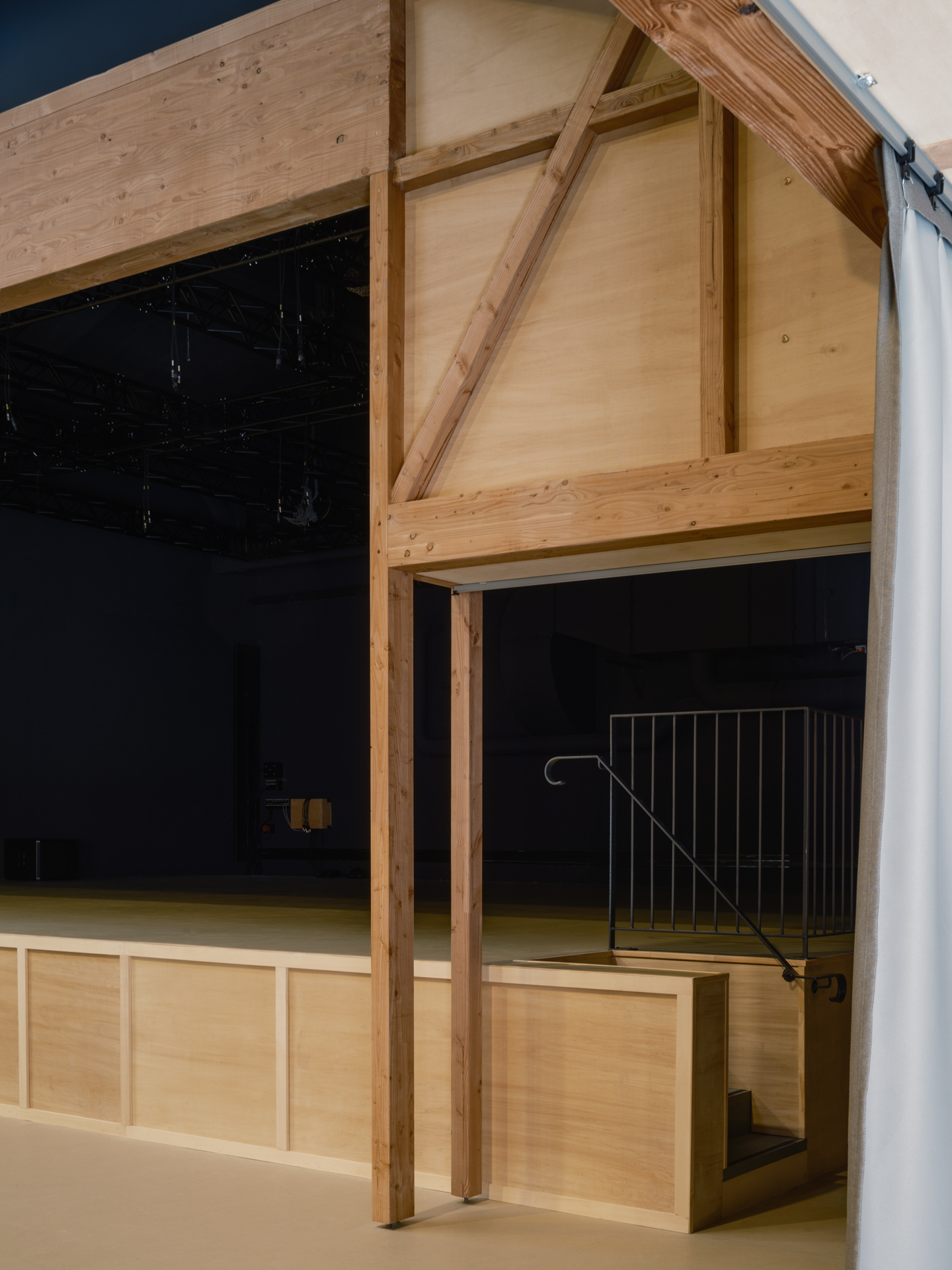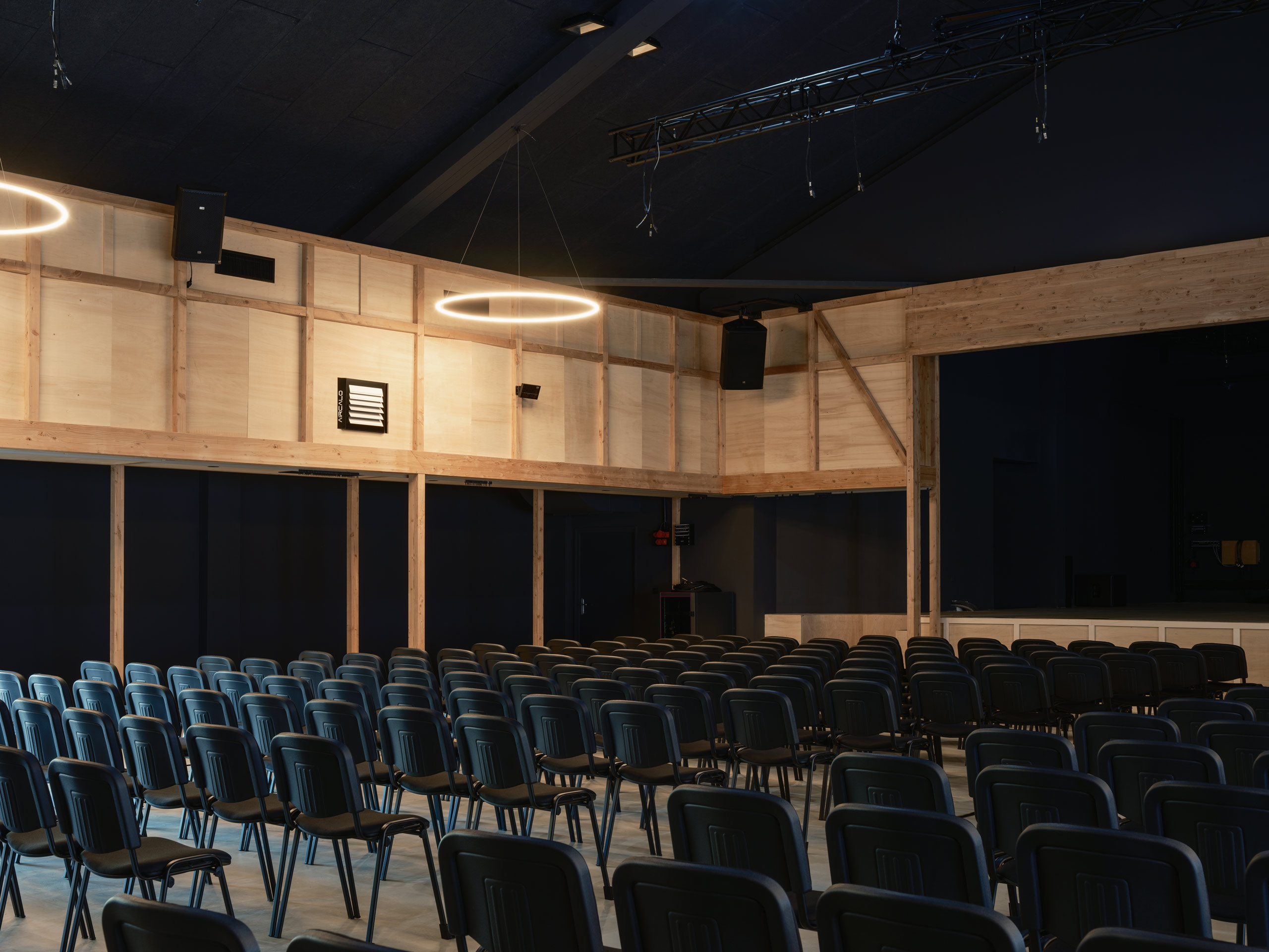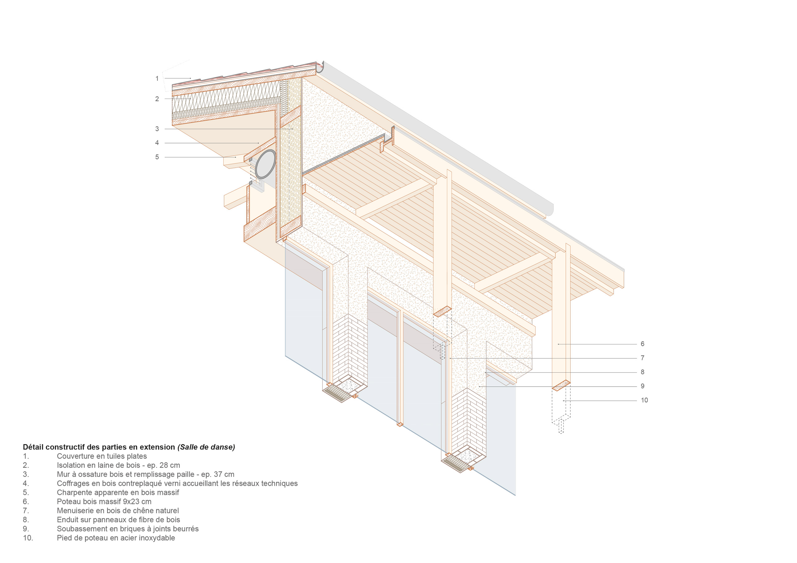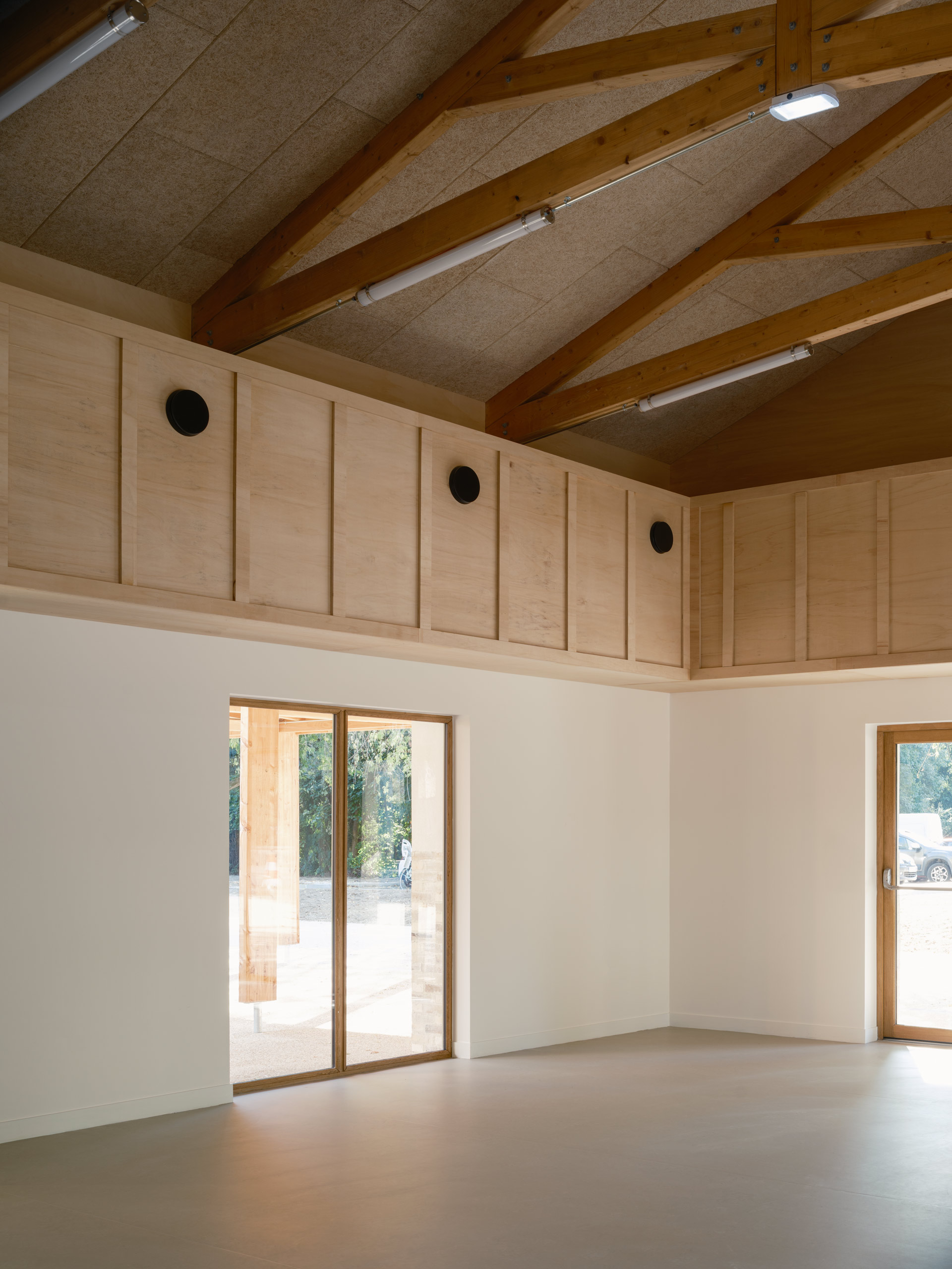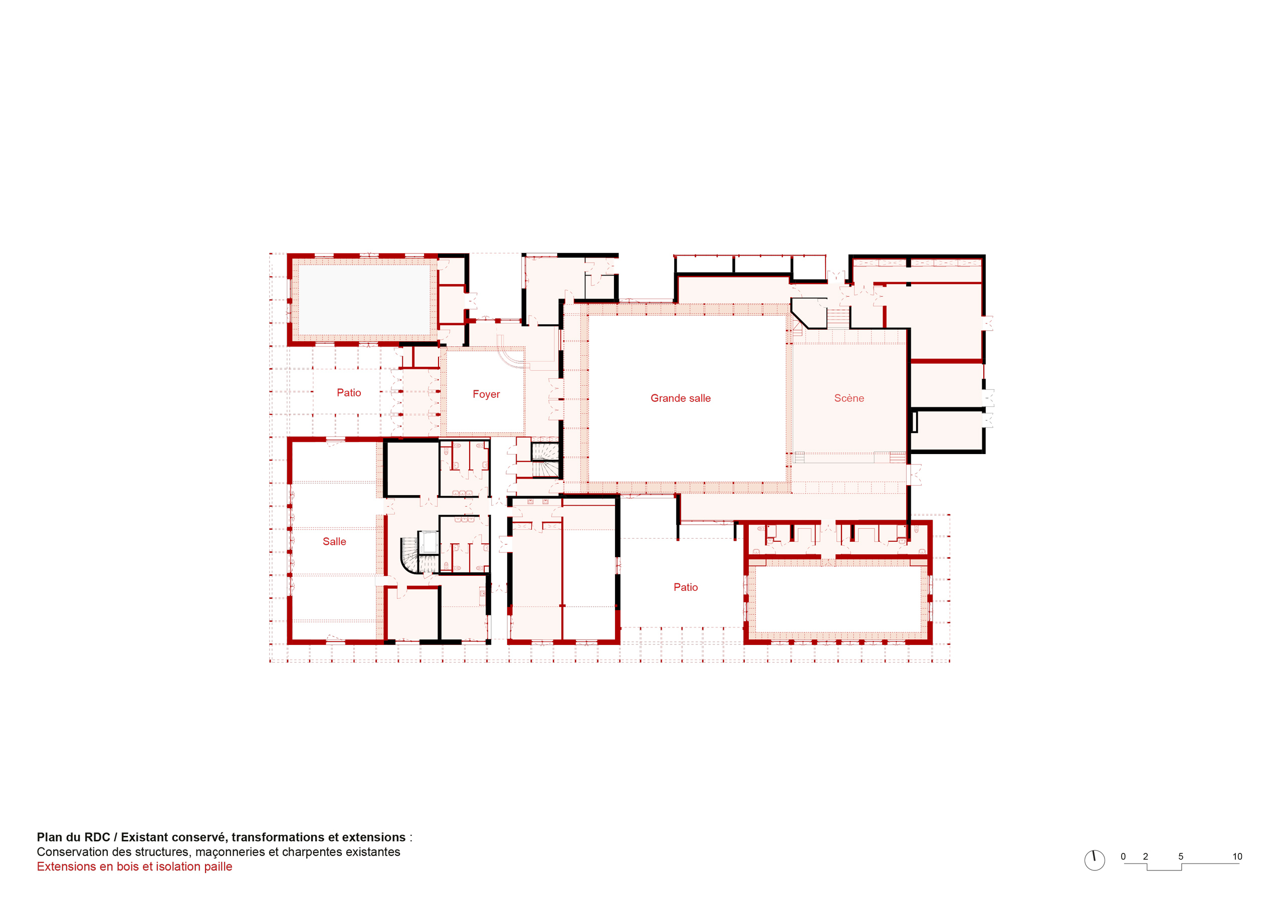 La relation entre le bâtiment et son site est repensée à travers une coursive périmétrale qui fait référence aux anciens équipements de loisir le long de l’Oise : elle cerne les volumes et constitue un espace intermédiaire, ouvert et couvert, qui devient accès principal côté ville et protection perméable côté fleuve. Polyvalent, il offre un espace de distribution extérieure, protège les pièces de l’ensoleillement direct et accompagne le visiteur dans une séquence maitrisée vers l’intérieur. La grande salle centrale est réaménagée par un dispositif intégrant les organes techniques et permettant de réorganiser l’espace en fonction de l’usage : concerts, expositions, réunions publiques…