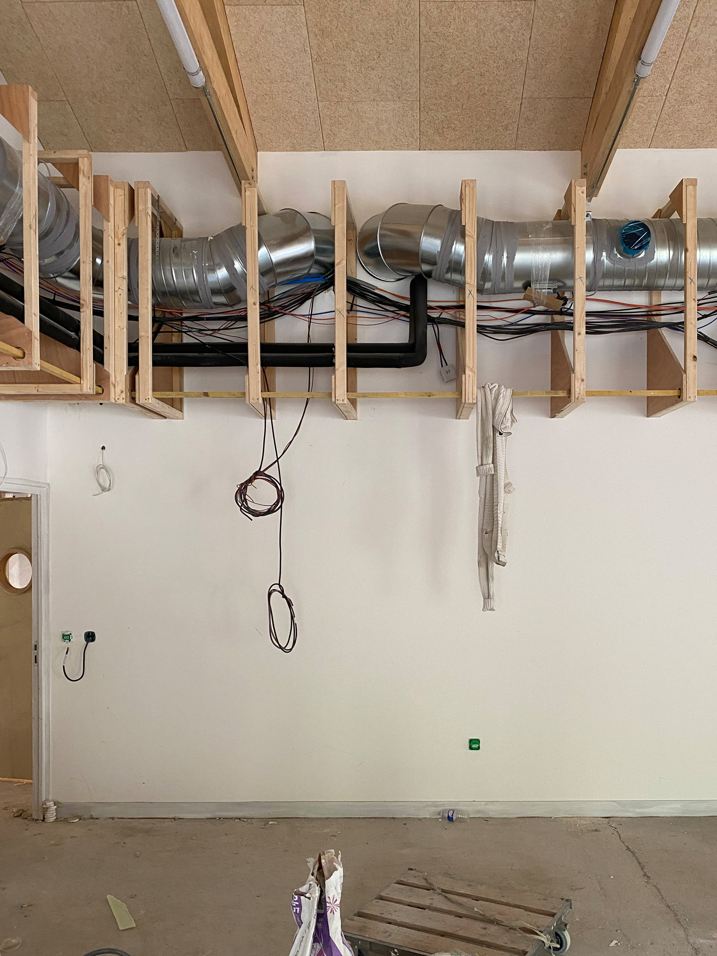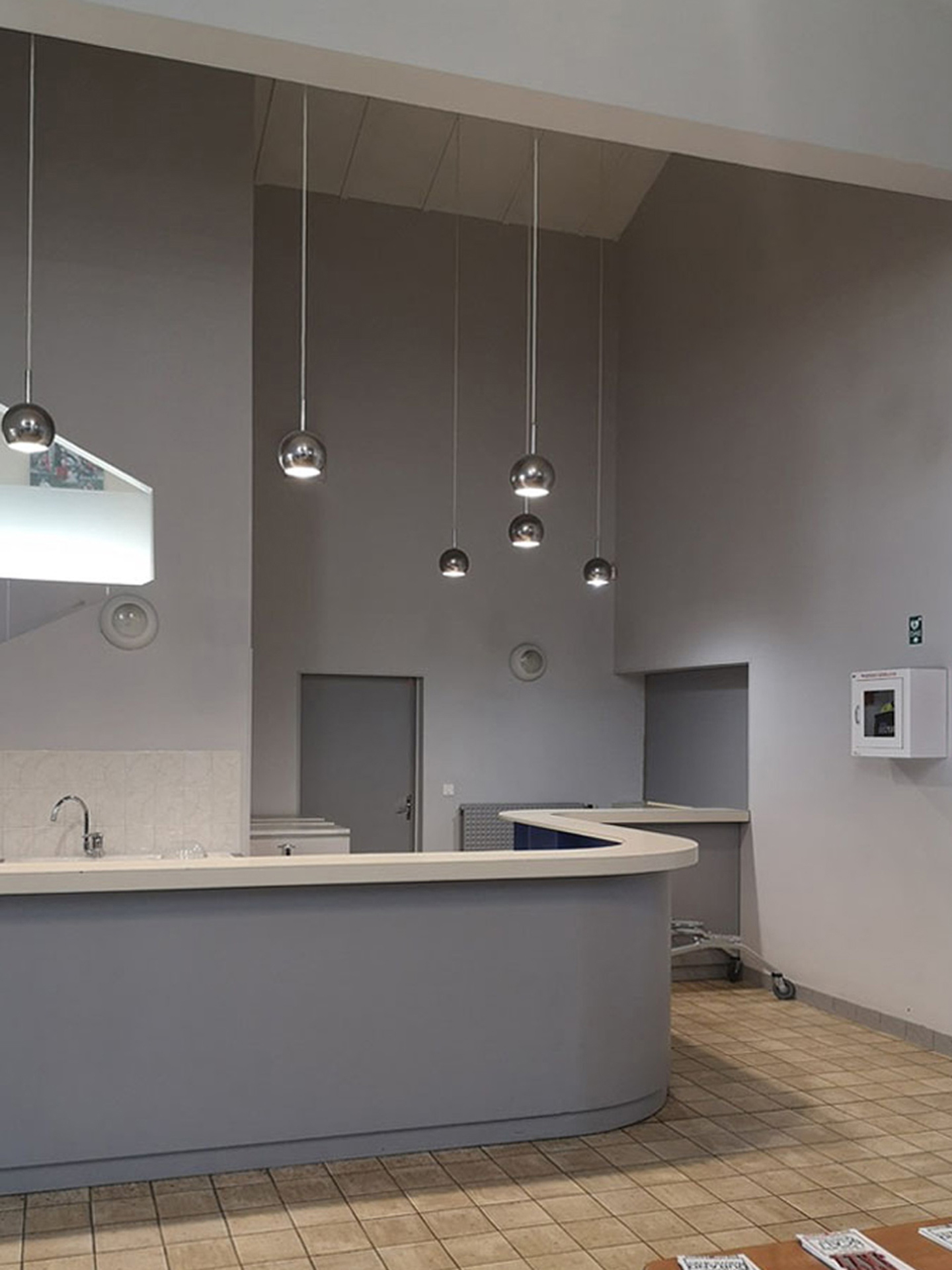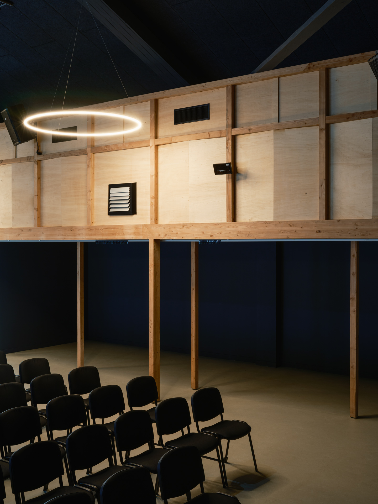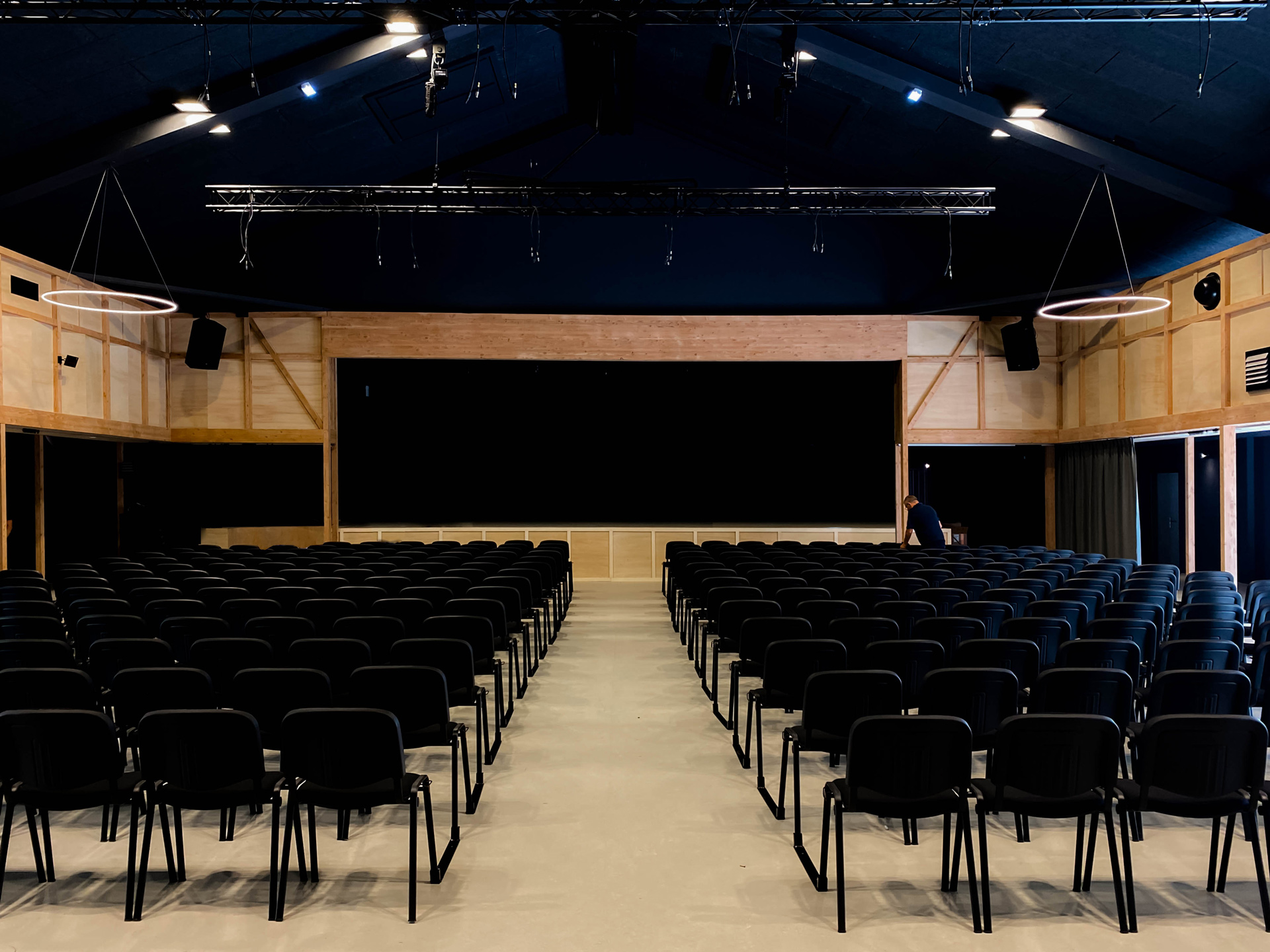 La relation entre le bâtiment et son site est repensée à travers une coursive périmétrale qui fait référence aux anciens équipements de loisir le long de l’Oise : elle cerne les volumes et constitue un espace intermédiaire, ouvert et couvert, qui devient accès principal côté ville et protection perméable côté fleuve. Polyvalent, il offre un espace de distribution extérieure, protège les pièces de l’ensoleillement direct et accompagne le visiteur dans une séquence maitrisée vers l’intérieur. La grande salle centrale est réaménagée par un dispositif intégrant les organes techniques et permettant de réorganiser l’espace en fonction de l’usage : concerts, expositions, réunions publiques…