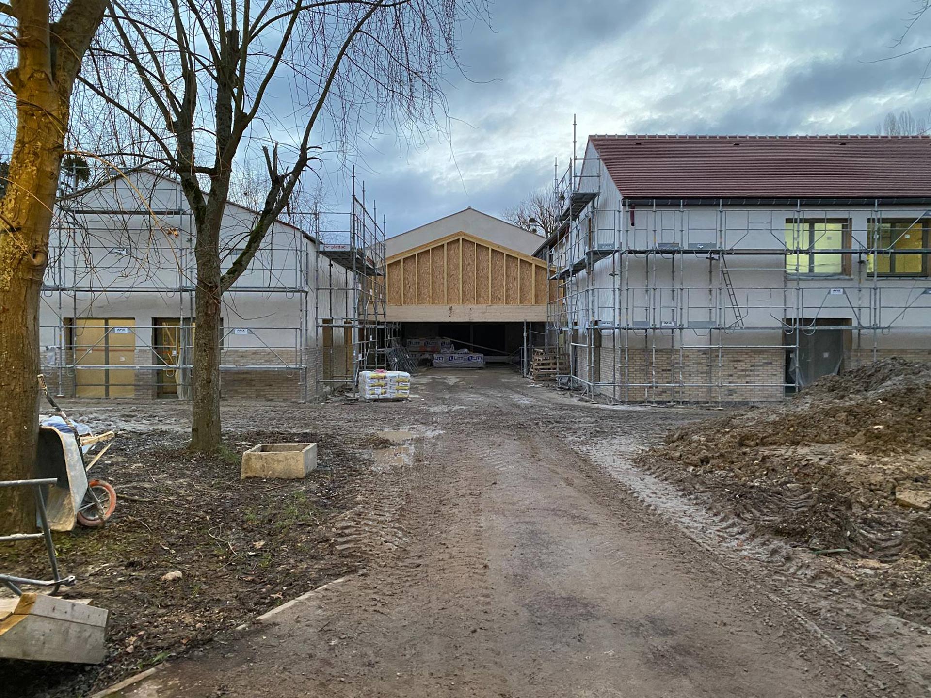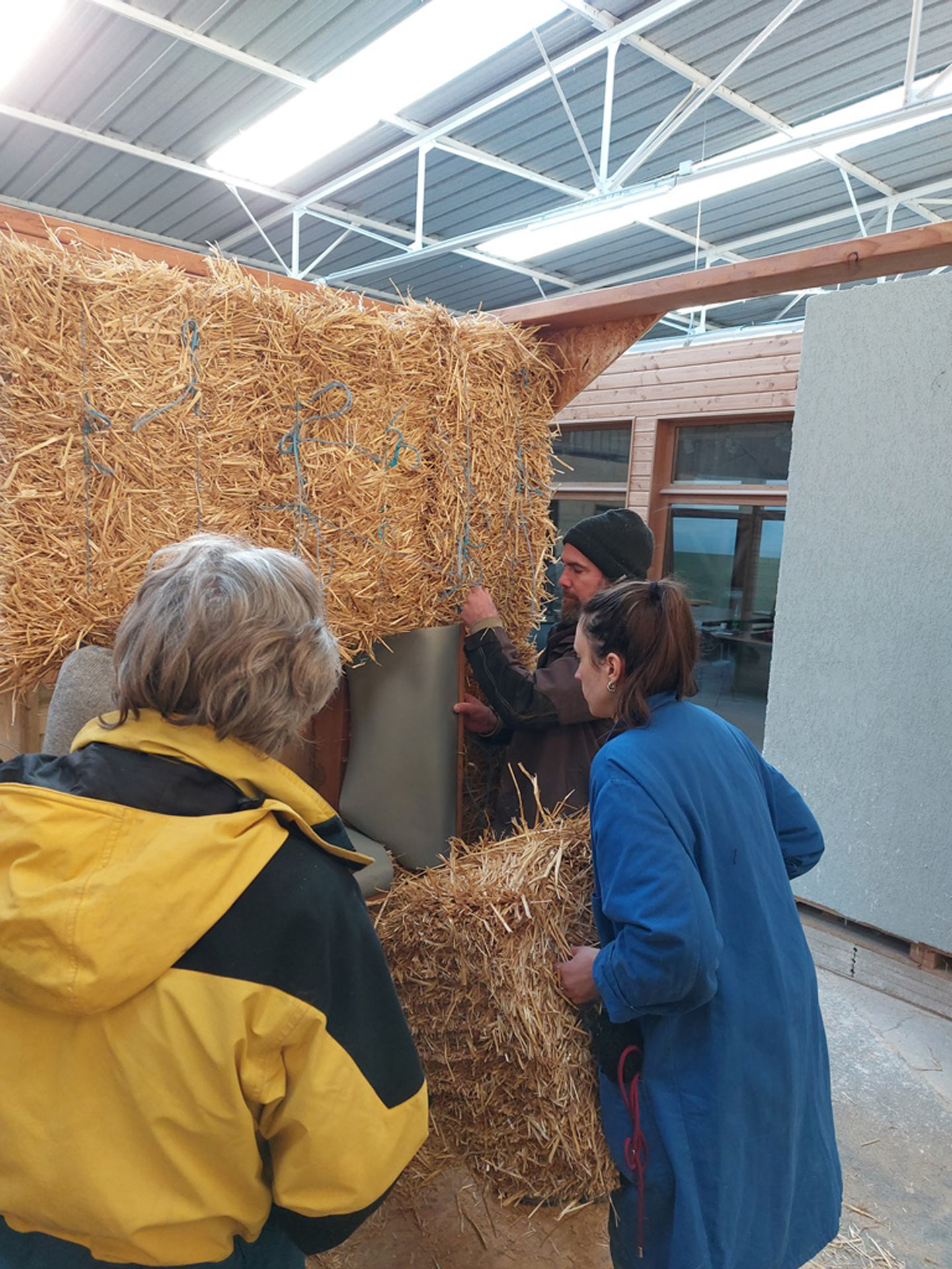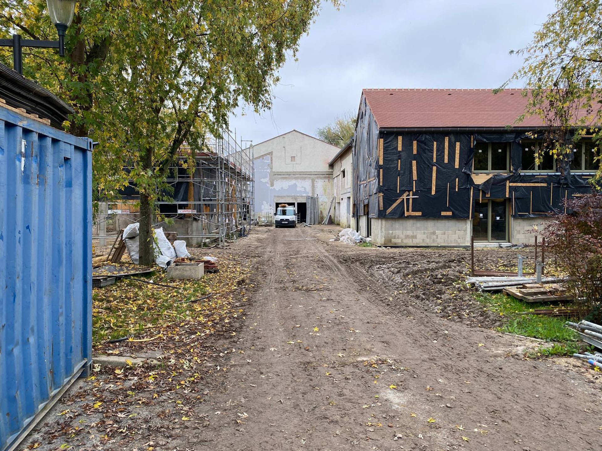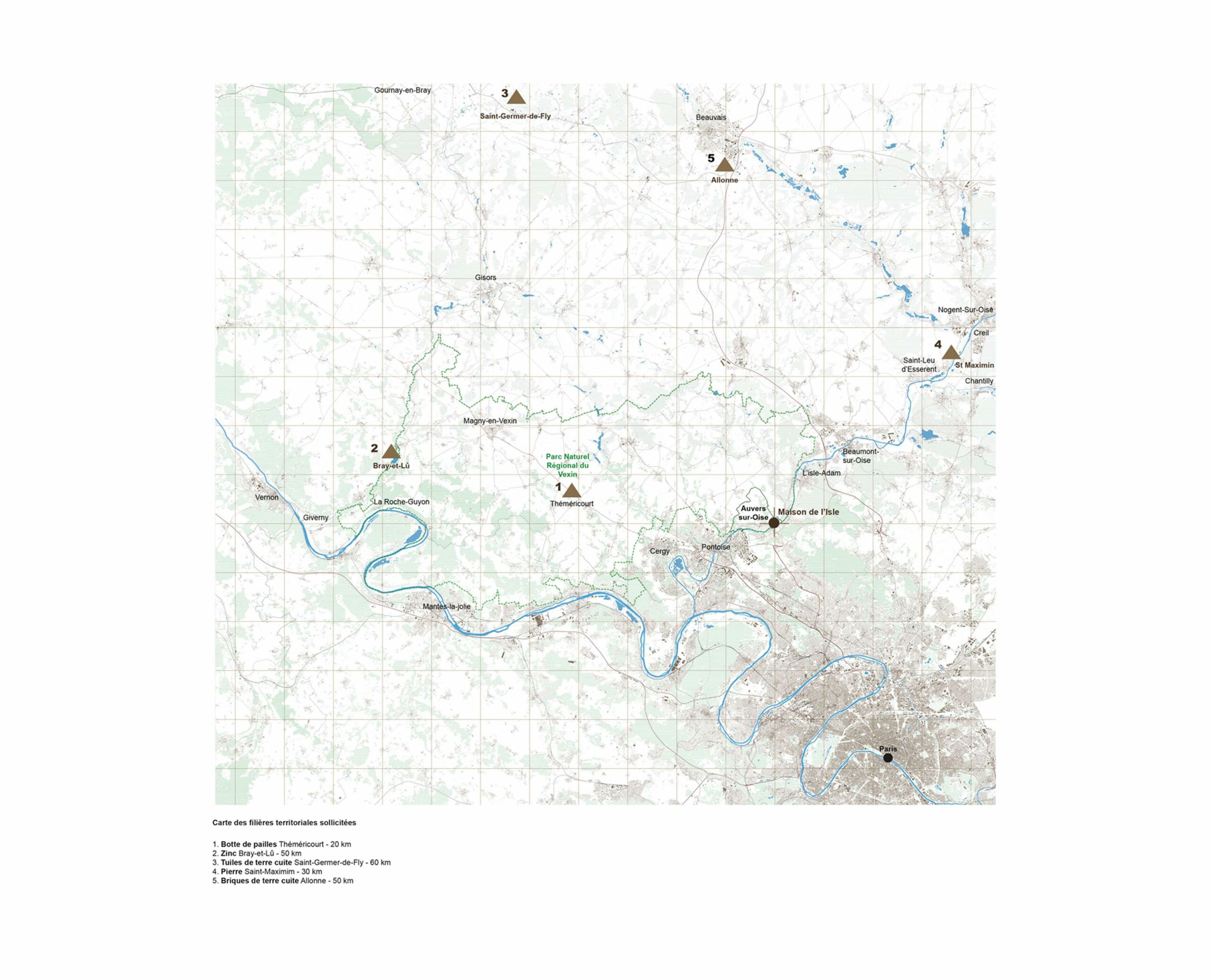 Le projet étend la notion de durabilité à l’échelle du territoire. Les matériaux de construction sont issus de ce dernier, avec une attention particulière portée aux filières : les extensions sont réalisées en structure bois et isolation paille, pour laquelle la filière locale du PNR du Vexin a été sollicitée. La tuile est fabriquée à Saint-Germer-de-Fly (60 km), la brique à Allonne (40 km), le zinc à Bray-et-Lû (50 km) et la pierre est extraite à Saint Maximin (40 km).