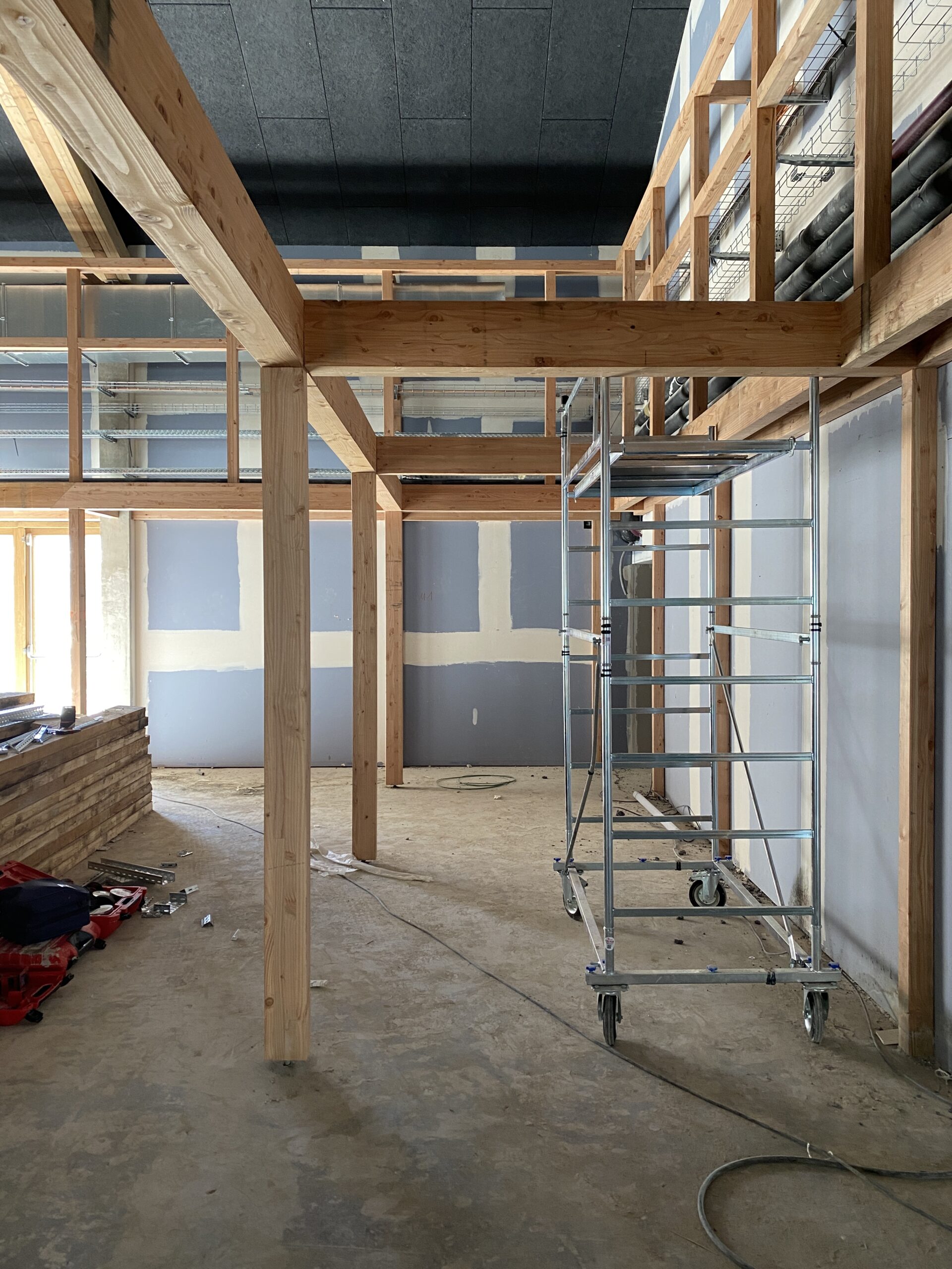 Le bâtiment existant, dont les structures sont en grande partie conservées, est simplifié dans sa forme et distribution. Il est complété par trois volumes polyvalents au profit d’échanges intergénérationnels, s’inscrivant dans le périmètre bâti actuel afin de limiter l’artificialisation du terrain. Ces extensions tirent profit du contexte, et se situent sur les trois angles les plus sollicités dans la relation avec le village et la rivière. Les intérieurs sont réaménagés à partir d’une série d’espaces d’accueil et circulation.