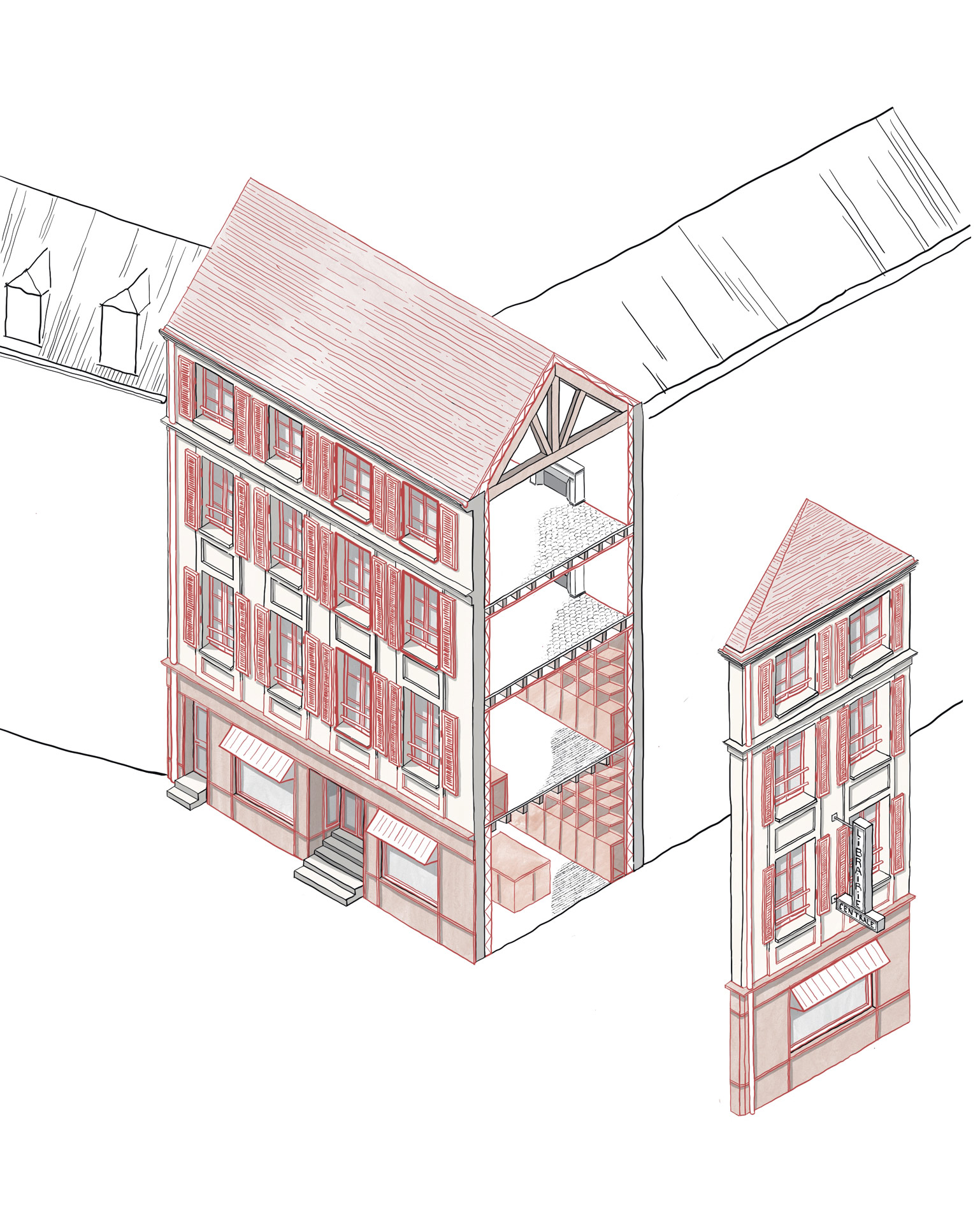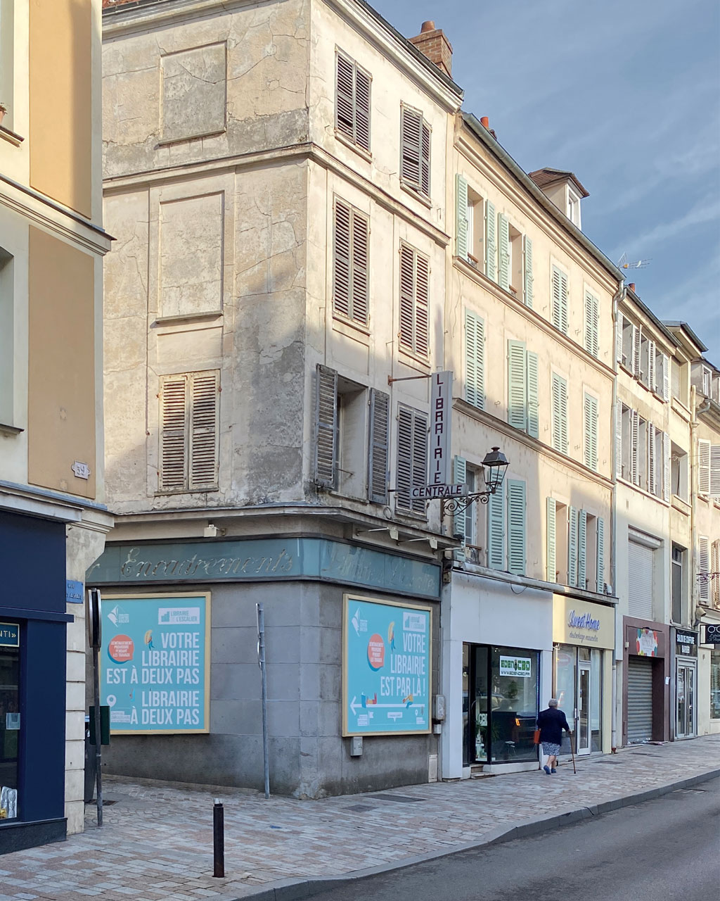 La réhabilitation d’un bâtiment vacant en cœur de ville répond à des enjeux contemporains majeurs : lutter contre l’étalement urbain, valoriser le centre ancien et renforcer son attractivité. À son emplacement stratégique, l’immeuble joue un rôle de proue urbaine à l’articulation de deux rues. Sa réhabilitation vise à le réinscrire dans un dialogue cohérent avec son environnement immédiat. Le maintien de la librairie, historiquement implantée à cette adresse, permet de préserver une offre de proximité et de qualité, et préserve la mémoire et la singularité du lieu.